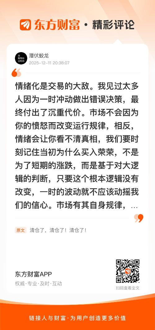 情绪化是交易的大敌。我见过太多人因为一时冲动做出错误决策,最终付出了沉重代价。市场不会因为你的愤怒而改变运行规律,相反,情绪会让你看不清真相,我们要时刻记住当初为什么买入荣荣,不是为了短期的涨跌,而是基于对大逻辑的判断,只要这个根本逻辑没有改变,一时的波动就不应该动摇我们的信心。市场有其自身规律,周Y及其背后的利益团伙的强行干预,也将会是短期性的,任何干预都只是暂时扭曲,而不会消灭趋势。聪明的交易者会利用这种扭曲,而不是被它吓倒。现在不是抱怨的时候,而是该静下心来分析:这次干预到底改变了什么,又没改变什么?好好问一下自己!时间成本对大部分散户来说成本最低的,急啥? 我在《清仓了,清仓了!清仓了!》的评论获得了大家的关注。