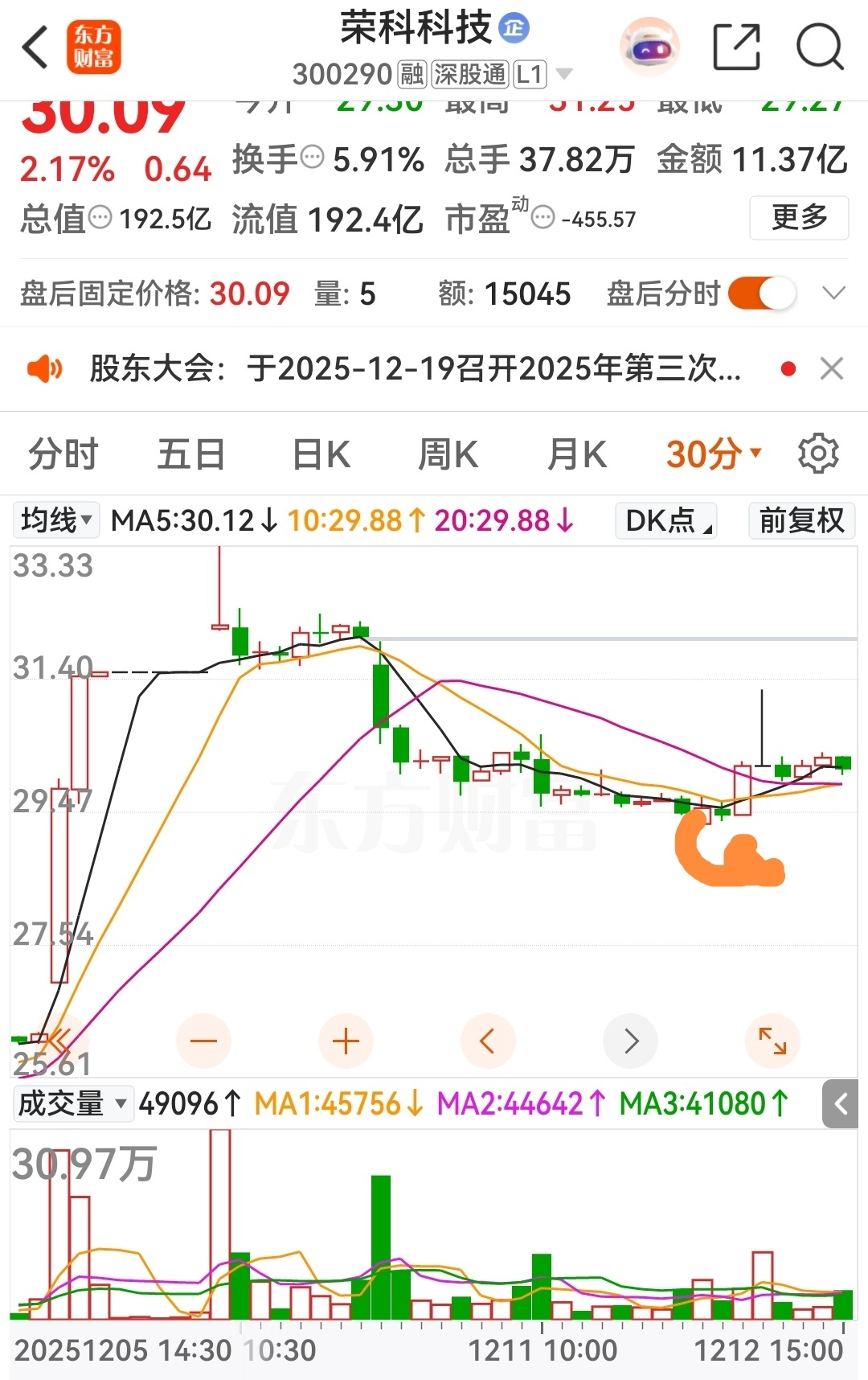荣科30分钟图,突破回踩不能再破低点(涂鸦处)。也就是不能再破29.4元