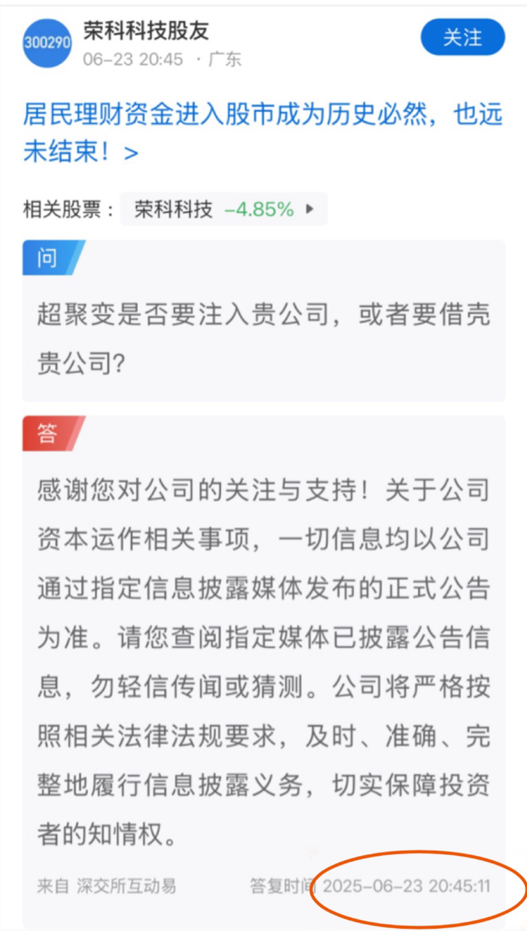 $荣科科技(SZ300290)$ 6月份回复…还在yy