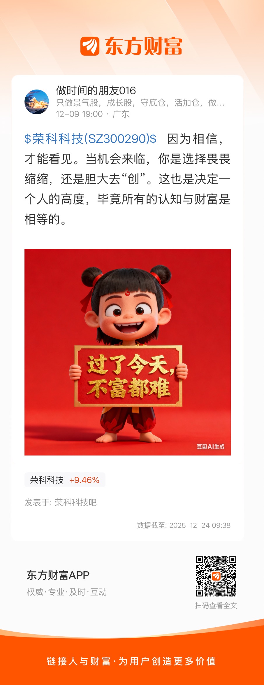 $荣科科技(SZ300290)$ 因为相信,才能看见。当机会来临,你是选择畏畏缩缩,还是胆大去“创”。这也是决定一个人的高度,毕竟所有的认知与财富是相等的。