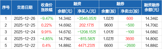 荣科科技:融资净偿还3546.05万元,融资余额14.34亿元(12-26)