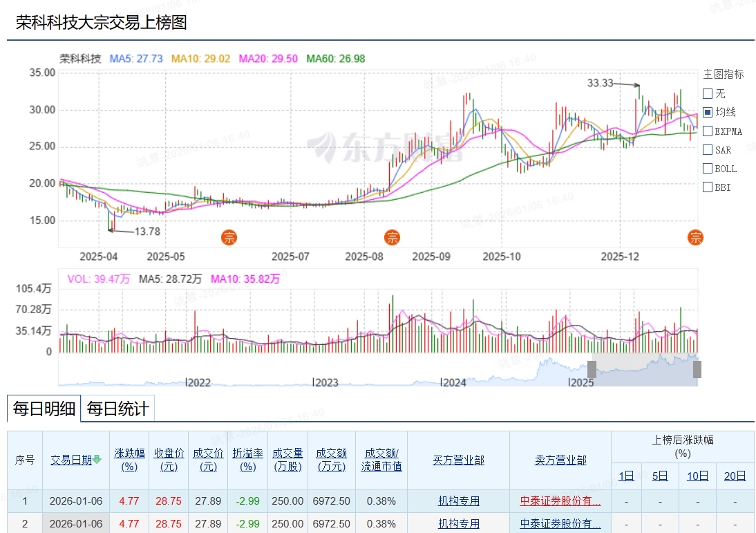 荣科今天两笔大宗交易,合计500万股,成交价27.89元,溢价率-2.99%,卖