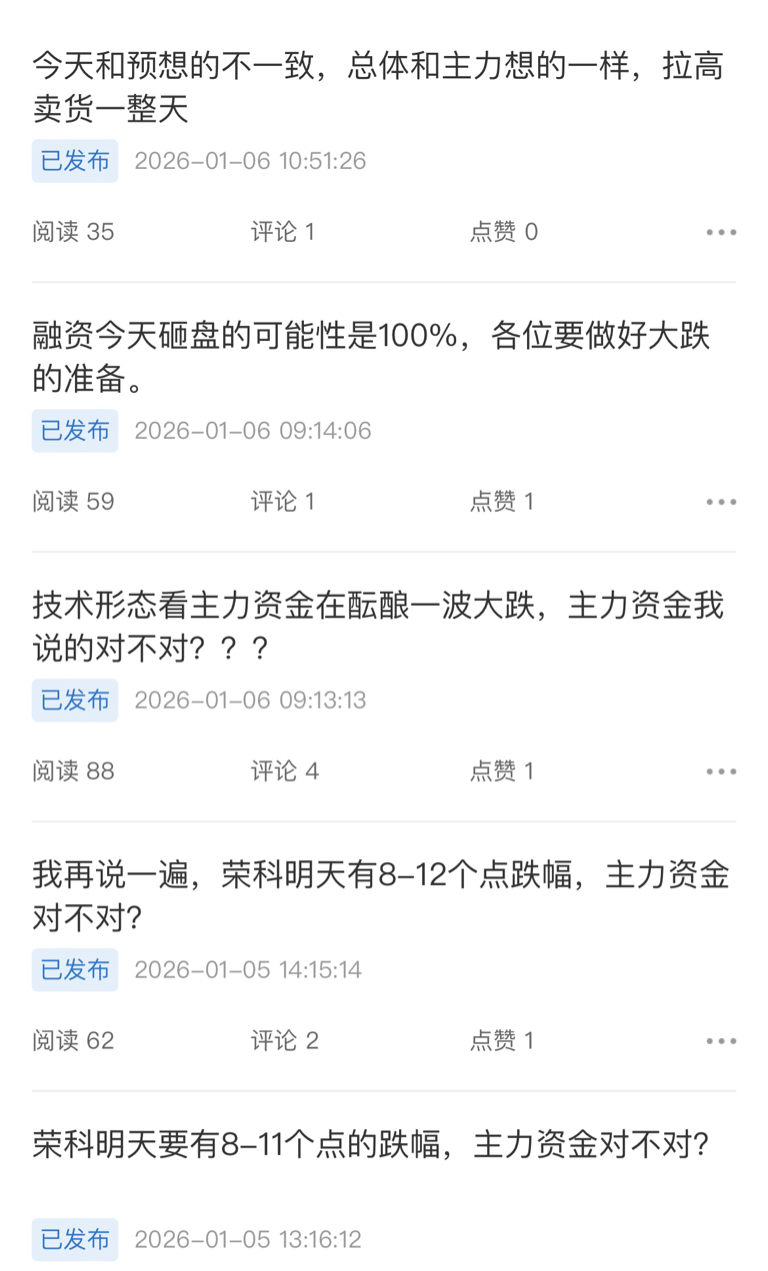 我于1月5日,1月6日多次提醒荣科要大跌,你们看看浏览量,如此可怜,6日上涨我再