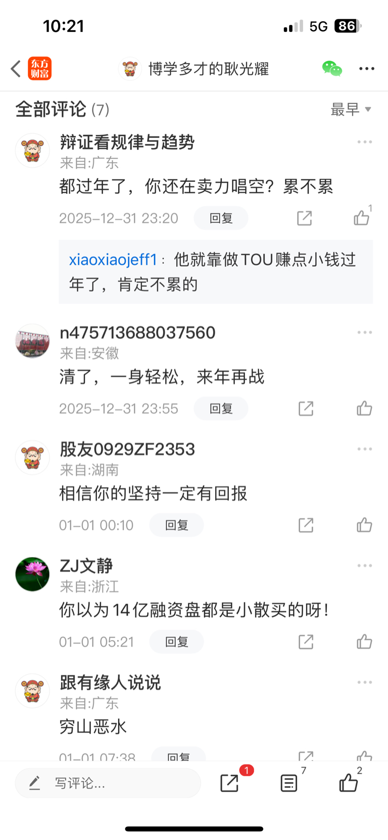 各位看看记录,12月30日,1月5日,1月6日我连续提醒各位要大跌,有人评论我是猴子派来搞笑的,装大尾巴狼,卖力唱空。