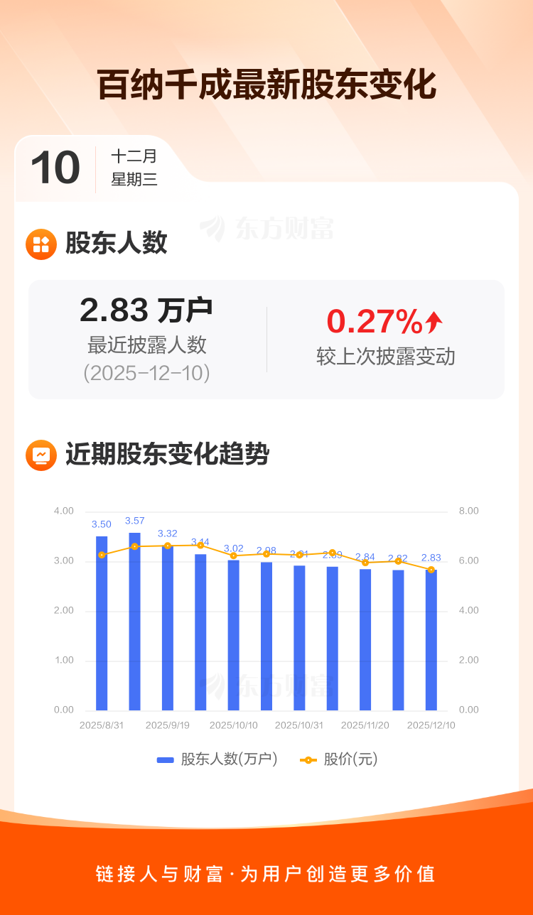 百纳千成:截至12月10日最新股东户数2.83万户,较上期增加0.27%
