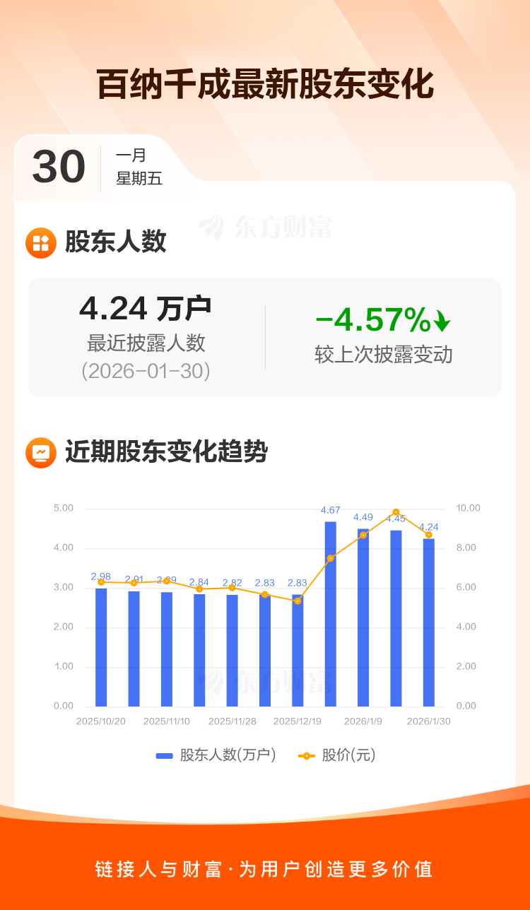 百纳千成最新披露数据显示,截至1月30日公司股东户数为4.24万户,较上期(2026年1月20日)减少2031户,降幅为4.57%。户均持有流通股数量由上期的2.09万股上升至2.19万股,户均持股金额由上期的20.58万元减少至19.05万元。