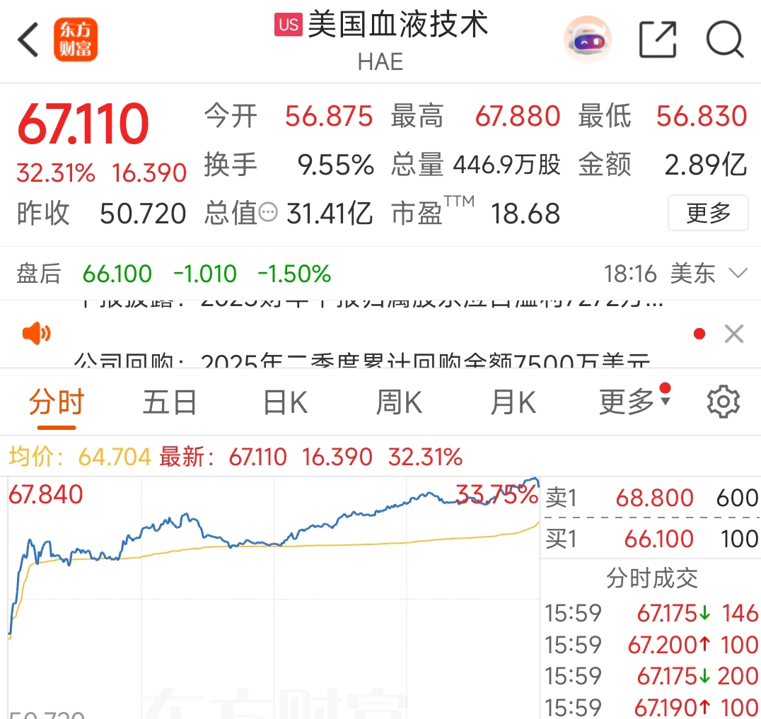 美股血液技术今晚暴涨30%多,博雅今天会不会补张啊!