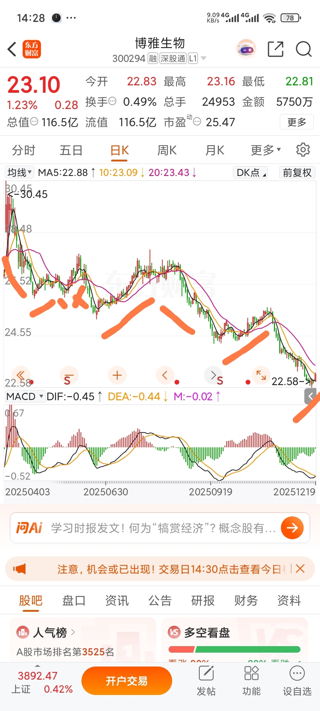 $博雅生物(SZ300294)$ 老套路,先跌一个月,反弹2-5%,然后又一路下跌一个月,这次反弹到23.5,然后一路下跌,跌到20块钱