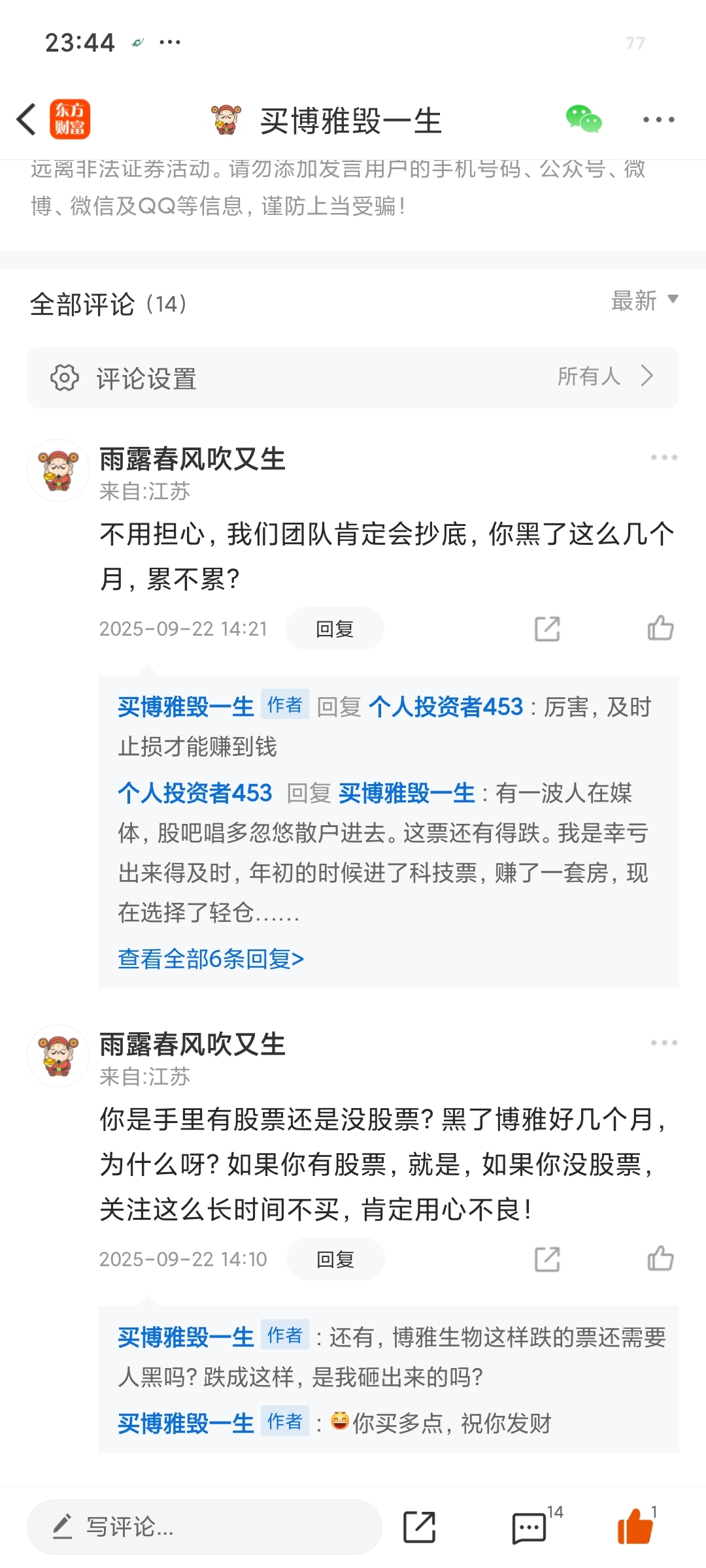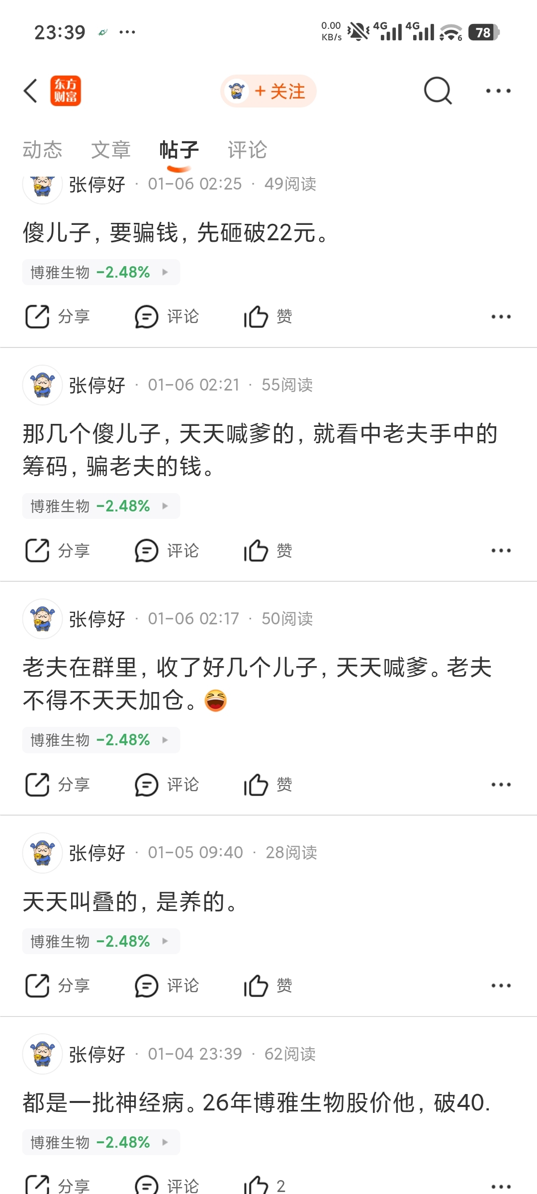 这个雨露春风吹又生不知道解套了没有,还是割肉跑了,那个时候还说坚定看好博雅生物,敢跌就敢加仓,还后悔看我的贴子没有敢买多点,还有那个张停好,天天老夫老夫的自称