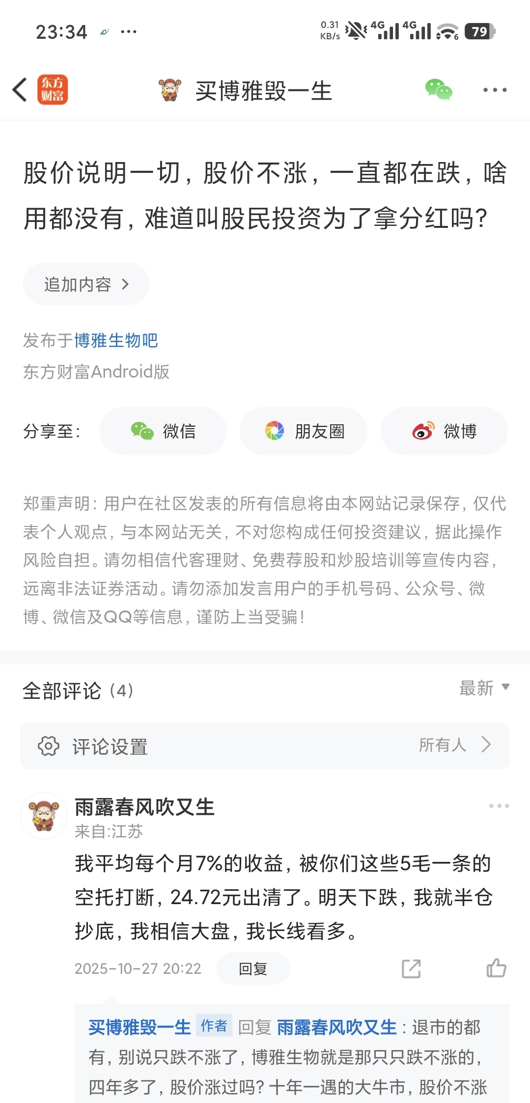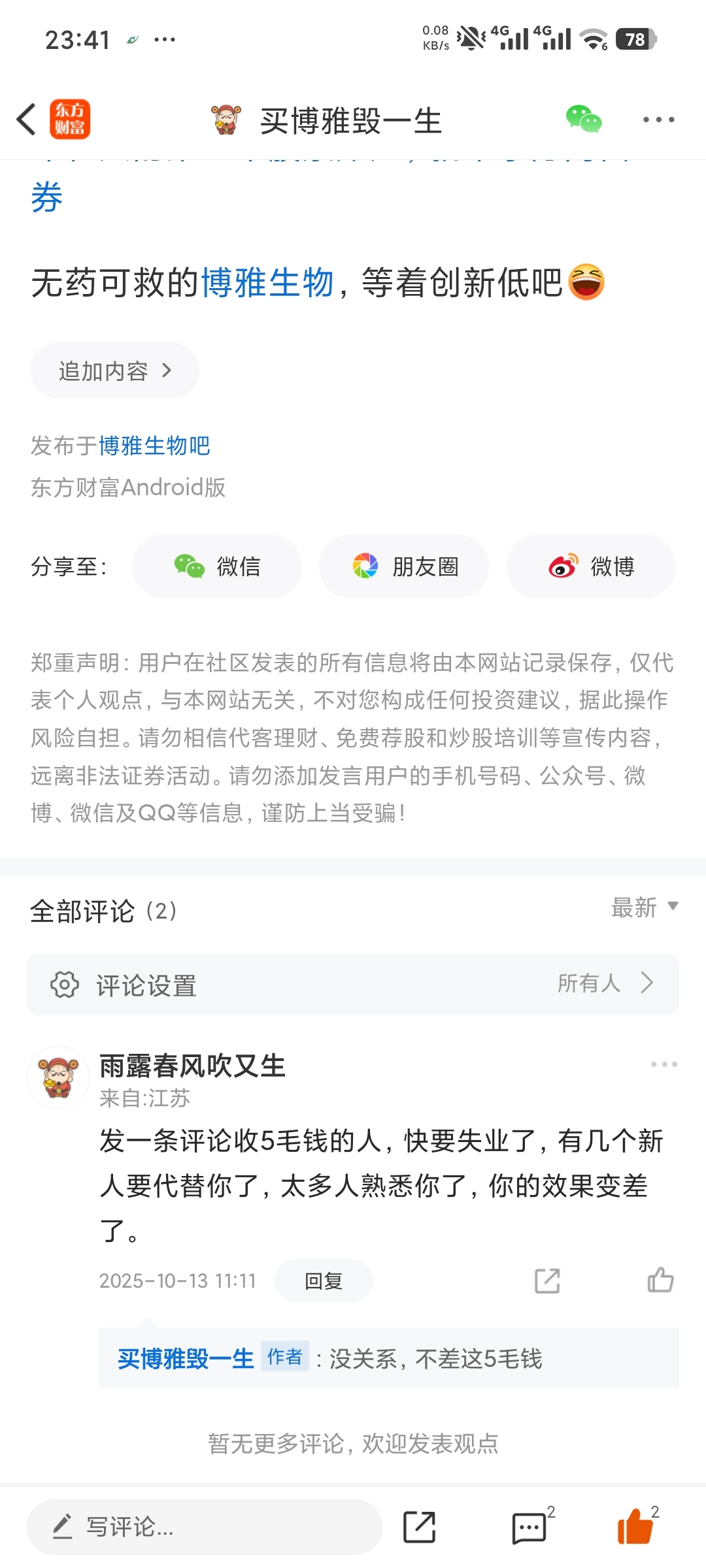 这个雨露春风吹又生不知道解套了没有,还是割肉跑了,那个时候还说坚定看好博雅生物,