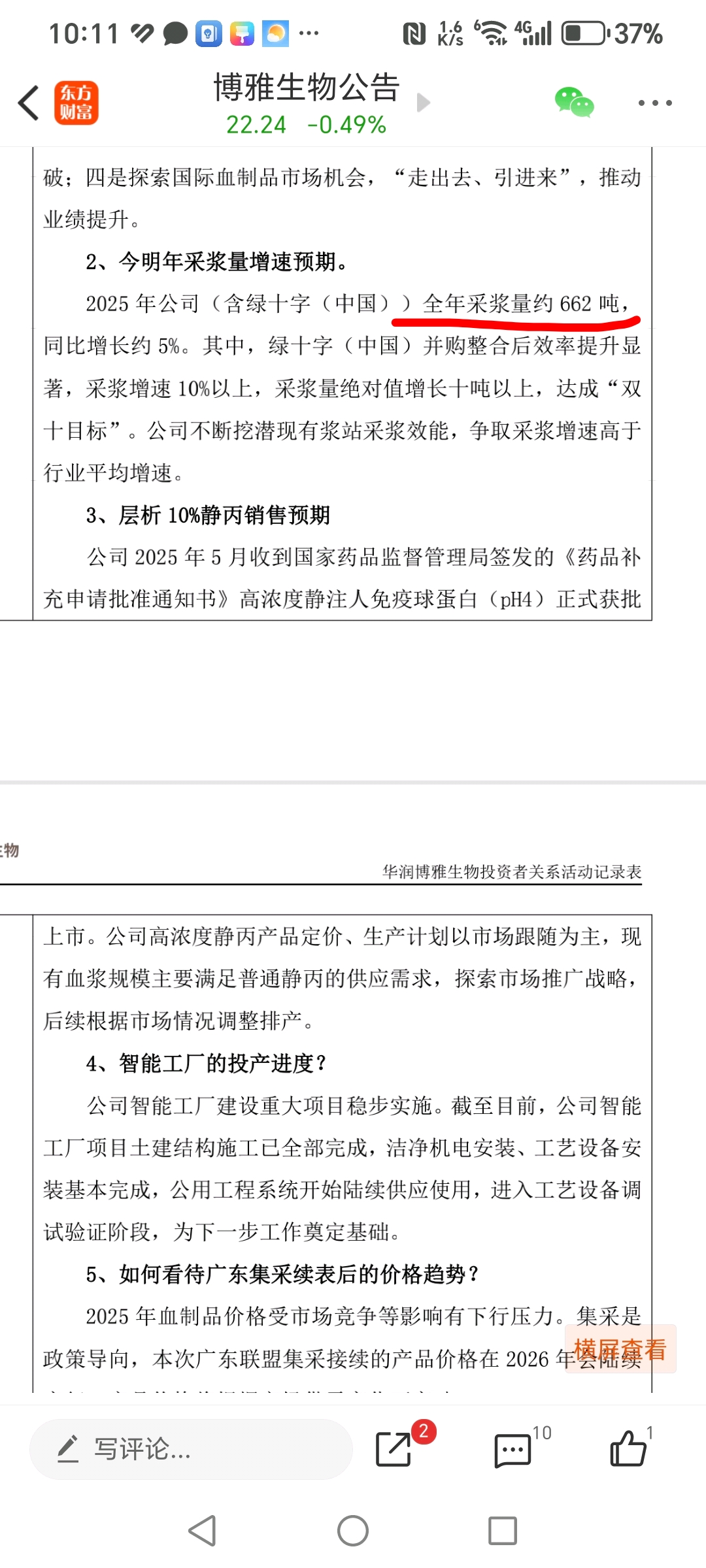 现金流,研发业务都挺好,就是采浆量增长慢了些,662吨。已经1600吨了