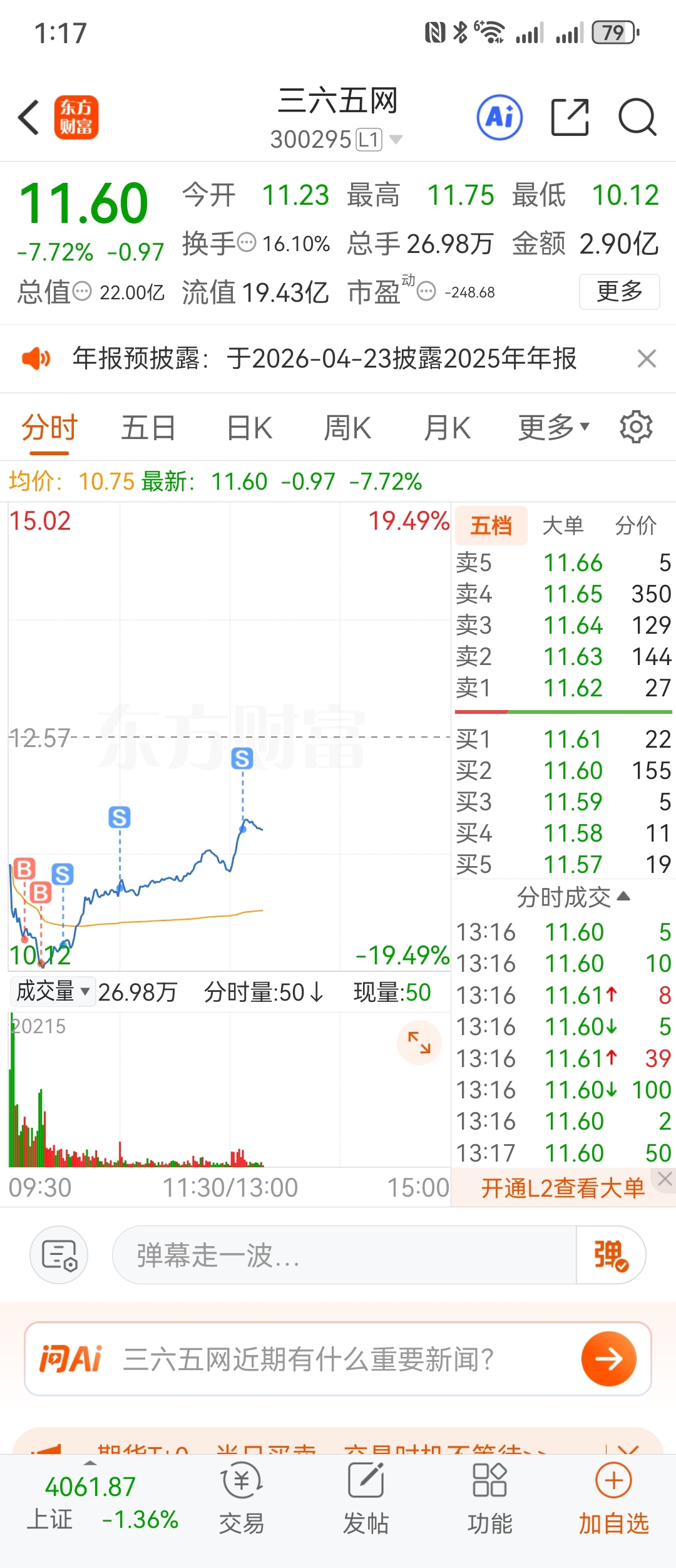 $三六五网(SZ300295)$ 11.7别忘记出底仓