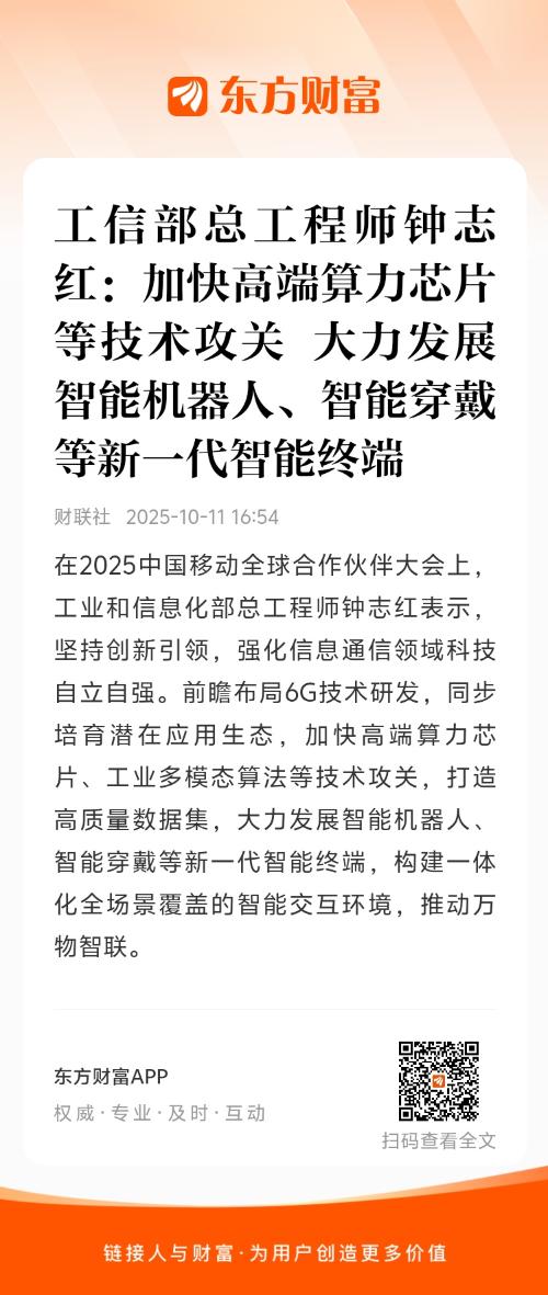 在2025中国移动全球合作伙伴大会上,工业和信息化部总工程师钟志红表示,坚持创新引领,强化信息通信领域科技自立自强。前瞻布局6G技术研发,同步培育潜在应用生态,加快高端算力芯片、工业多模态算法等技术攻关,打造高质量数据集,大力发展智能机器人、智能穿戴等新一代智能终端,构建一体化全场景覆盖的智能交互环境,推动万物智联。