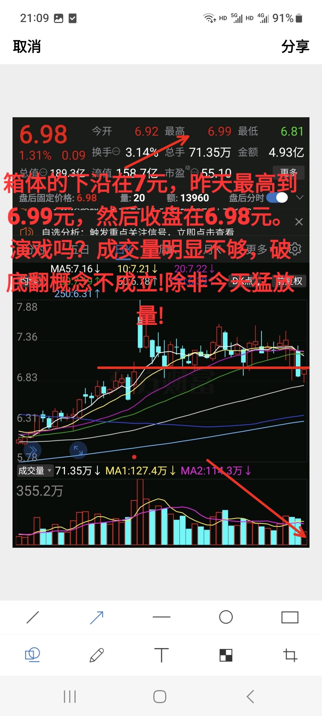 我个人的认为,昨天的盘面6.99和6.98就是人为控盘的结果,今天大概率会收复到7元之上,G价依然回到原来的箱体之内运行。