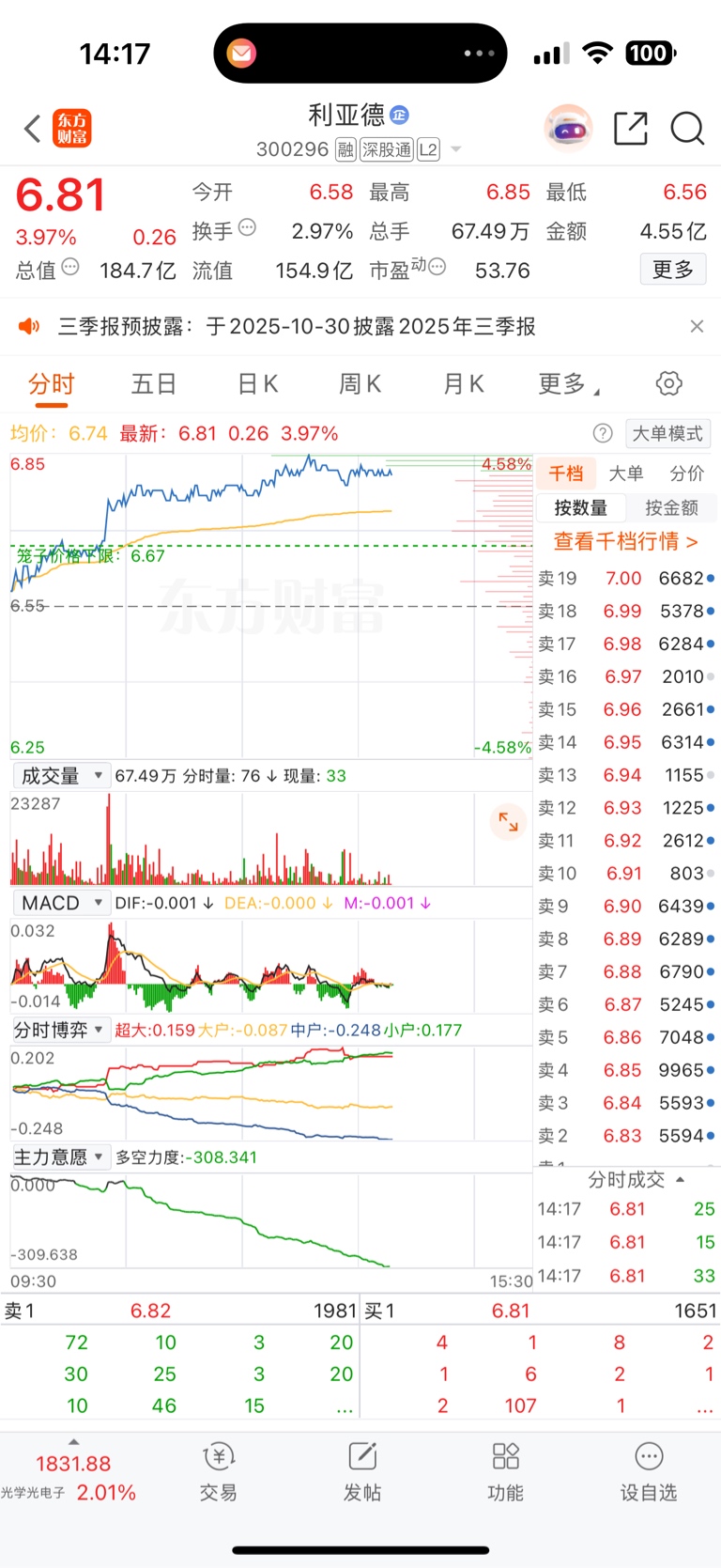 $利亚德(SZ300296)$ 卖一到卖二十,有十一个都是五千手以上的卖单,上不去了,马上就要开始跳水