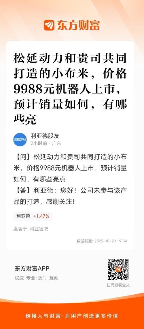 $利亚德(SZ300296)$$中大力德(SZ002896)$松延动力发布全球首个售价一万元以下的人形机器人!用的就是利亚德虚拟动点的技术啊。但是具体产品打造,利亚德肯定不会参与,它只提供软件、算法。