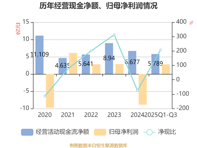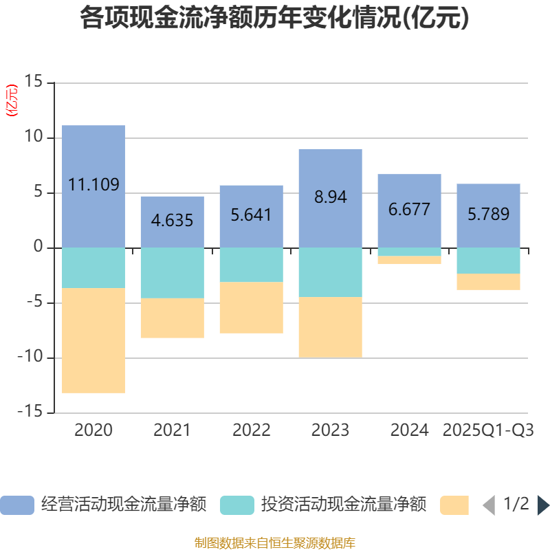 2025年前三季度,公司经营活动现金流净额为5.79亿元,同比增长107.46%;筹资活动现金流净额-1.49亿元,同比减少3086.56万元;投资活动现金流净额-2.38亿元,上年同期为-1.88亿元。