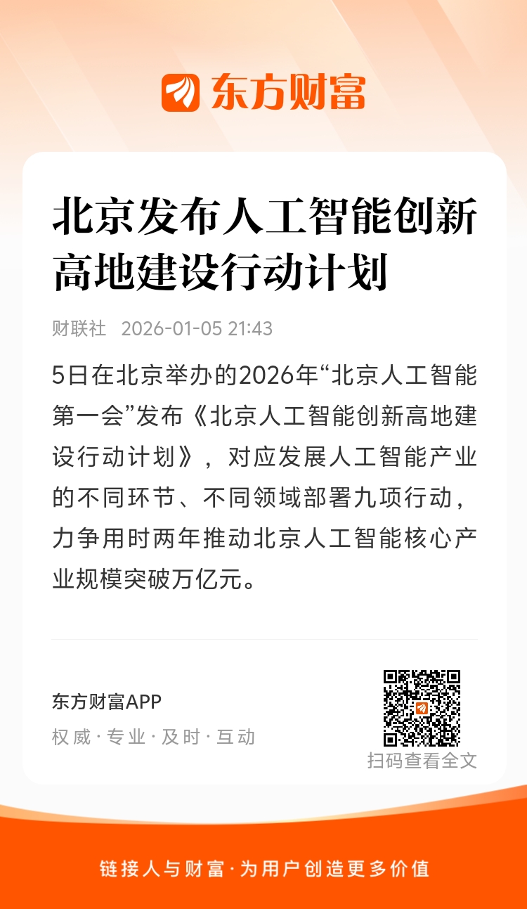 5日在北京举办的2026年“北京人工智能第一会”发布《北京人工智能创新高地建设行动计划》,对应发展人工智能产业的不同环节、不同领域部署九项行动,力争用时两年推动北京人工智能核心产业规模突破万亿元。