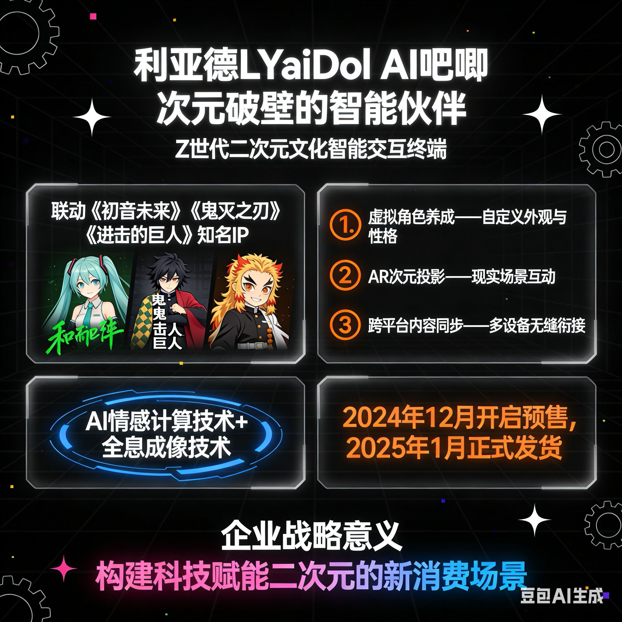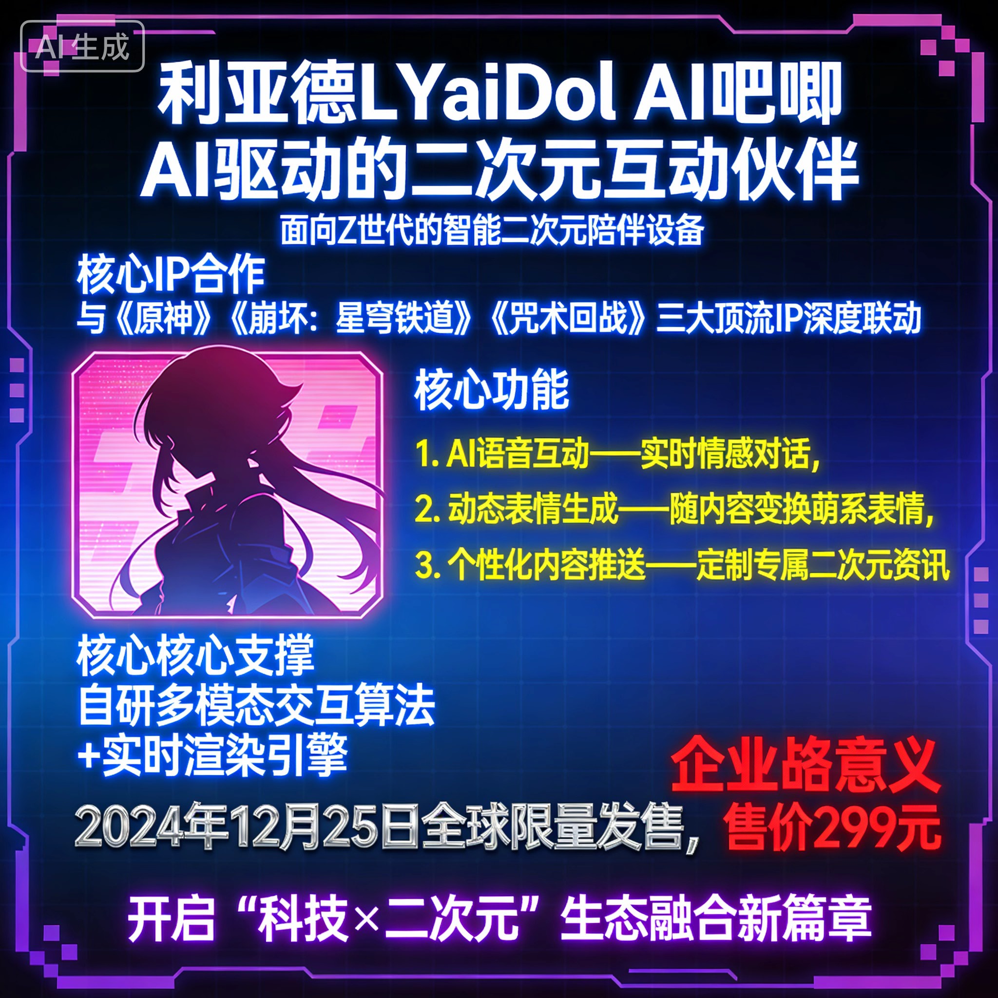 利亚德LYaiDol AI吧唧是公司锚定**“显示+文旅+AI与空间计算”** 核心战略,布局AI+IP赛道的首款C端智能交互产品,也是其将硬核科技落地大众文娱消费场景的关键尝试,以二次元圈层熟知的“吧唧(徽章)”为载体,融合AI多模态交互技术,打造兼具收藏价值与情感陪伴的智能周边,核心与美依礼芽独家深度共创,精准触达二次元“谷圈”、粉丝经济等年轻消费市场。
