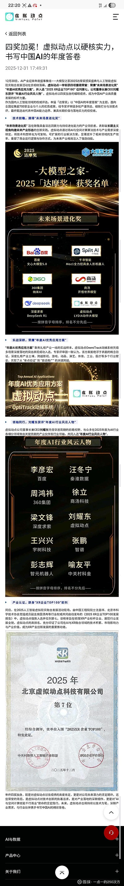 当元宇宙、具身智能与商业航天的浪潮席卷全球,利亚德这家以LED显示起家的行业龙头,正以“显示+”为支点,构建起一个横跨AI、机器人、商业航天与XR的硬科技生态矩阵。透过北京虚拟动点的技术突破、共青城道盈盛远的产业布局,我们可以清晰看到利亚德如何从单一显示设备供应商,进化为推动中国硬科技产业升级的核心力量。一、AI与空间计算:虚拟动点的技术破壁北京虚拟动点作为利亚德的全资子公司,已成为集团在AI与空间计算领域的“技术尖刀”。在2025达摩奖评选中,它一举斩获“未来场景进化奖”“年度AI优秀应用方案”等四项大奖,并入选“2025 XR企业TOP100”位列第七,这不仅是对其技术实力的认可,更标志着利亚德在AI领域的战略突破。1. 技术底座:从动作捕捉到具身智能虚拟动点的核心竞争力,源于OptiTrack光学动作捕捉技术与LYDIA动作大模型的深度融合。OptiTrack毫米级精度的定位能力,已服务于《流浪地球》《黑神话:悟空》等顶级影视游戏项目,为虚拟角色赋予了拟真的运动轨迹。而与北大AI院联合研发的LYDIA 2.0大模型,更是将这一能力推向了具身智能的新高度。该模型依托年产600万+高质量动作数据的训练能力,实现了从动作生成到跨模态语义理解的全链条突破。在石景山共建的超万平方米人形机器人数据训练场内,OptiTrack系统正在为国内TOP10机器人企业提供技术支撑,包括优必选、宇树科技、智元机器人等头部玩家。值得一提的是,其技术曾助力机器人实现乒乓球连击106次的世界纪录,并在世界人形机器人运动会中担任“数据判官”,为机器人动作精度提供权威验证。2. 场景落地:从影视工业到千行百业虚拟动点的技术能力已突破娱乐场景的边界,向工业、医疗、体育等领域深度渗透。在工业仿真领域,它为波音、奥迪等企业提供高精度动作捕捉方案,提升生产效率与安全系数;在医疗场景中,其动捕技术可用于手术模拟与康复训练;在体育领域,通过动作分析助力运动员技术优化。这种“技术+场景”的深度绑定,正是其获得“未来场景进化奖”的核心原因——它不仅提供工具,更重构了行业的协作逻辑与商业运行模式。二、具身智能时代:机器人赋能生态的深度布局在全球人形机器人产业爆发前夜,利亚德通过虚拟动点构建起一套从技术底层到场景落地的机器人赋能体系,成为中国具身智能产业崛起的关键支撑力量。1. 技术核心:OptiTrack+LYDIA破解机器人“模仿学习”难题虚拟动点的技术能力直击当前人形机器人发展的核心痛点——高精度动作感知与高效行为模仿。- OptiTrack光学动捕系统:以毫米级定位精度、亚毫秒级延迟,实现对机器人关节运动的实时捕捉与验证。在世界人形机器人运动会中,该系统担任“数据判官”,为全球参赛机器人的动作精度提供权威基准;更曾助力合作企业实现机器人乒乓球连续对打106次的世界纪录,验证了其在动态场景下的稳定性。- LYDIA动作大模型:与北京大学人工智能研究院联合研发的2.0版本,依托年产超600万条高质量动作数据的训练能力,可实现从人类动作到机器人指令的跨模态语义理解与生成。该模型已在优必选Walker S2、宇树H1等头部人形机器人上完成适配,将机器人动作训练效率提升40%以上,关节角度误差控制在0.1以内。2. 深度绑定:覆盖国内TOP10机器人企业的技术伙伴虚拟动点已实现对国内具身智能领域TOP10头部企业的合作全覆盖,技术渗透至机器人研发、测试与量产全周期:- 优必选:为其Walker系列人形机器人提供动作捕捉与数据验证,支撑复杂场景下的步态优化与行为决策。- 宇树科技:OptiTrack系统深度嵌入宇树H1人形机器人与Go1四足机器人的测试环节,通过实时动作反馈优化运动算法。- 智元机器人:为“远征A1”提供高精度空间定位能力,提升机器人在非结构化环境中的避障与交互效率。- 乐聚机器人:在石景山共建超万平方米人形机器人数据训练场,联合开发面向服务场景的动作库。- 松延动力:独家战略合作,为其核心关节模组提供动态性能测试与数据校准,提升运动精度与耐用性。- 钛虎机器人:OptiTrack动捕技术用于机器人极限动作测试,支撑工业场景下的负载与稳定性验证。- 银河通用:提供航天级动作捕捉方案,为特种机器人在极端环境下的作业提供技术保障。- 新松机器人:赋能工业机器人的远程运维与数字孪生场景,提升产线智能化水平。- 海康机器人:结合空间计算能力优化移动机器人的SLAM算法,提升复杂场景下的导航精度。- 科沃斯:为服务机器人提供家庭场景下的动作交互设计,提升人机协作体验。这些合作不仅是技术输出,更构建了“设备供应-数据训练-算法优化”的闭环服务,使虚拟动点成为机器人企业不可或缺的技术伙伴。3. 场景规模化:从实验室到千行百业利亚德的机器人赋能能力已从实验室走向千行百业,形成多场景标杆案例:- 工业制造:为某汽车厂商提供机器人焊接动作优化方案,通过OptiTrack实时捕捉焊接轨迹,结合LYDIA大模型分析,将焊接精度提升15%,不良率降低22%。- 航天工程:为商业航天企业提供火箭箭体对接模拟训练,通过XR+动捕技术还原复杂装配场景,缩短航天员培训周期30%。- 医疗康复:与三甲医院合作开发康复机器人,通过动作捕捉分析患者步态数据,结合AI模型生成个性化康复方案,使下肢运动功能恢复效率提升28%。- 公共服务:在2025年北京服贸会中,虚拟动点技术支