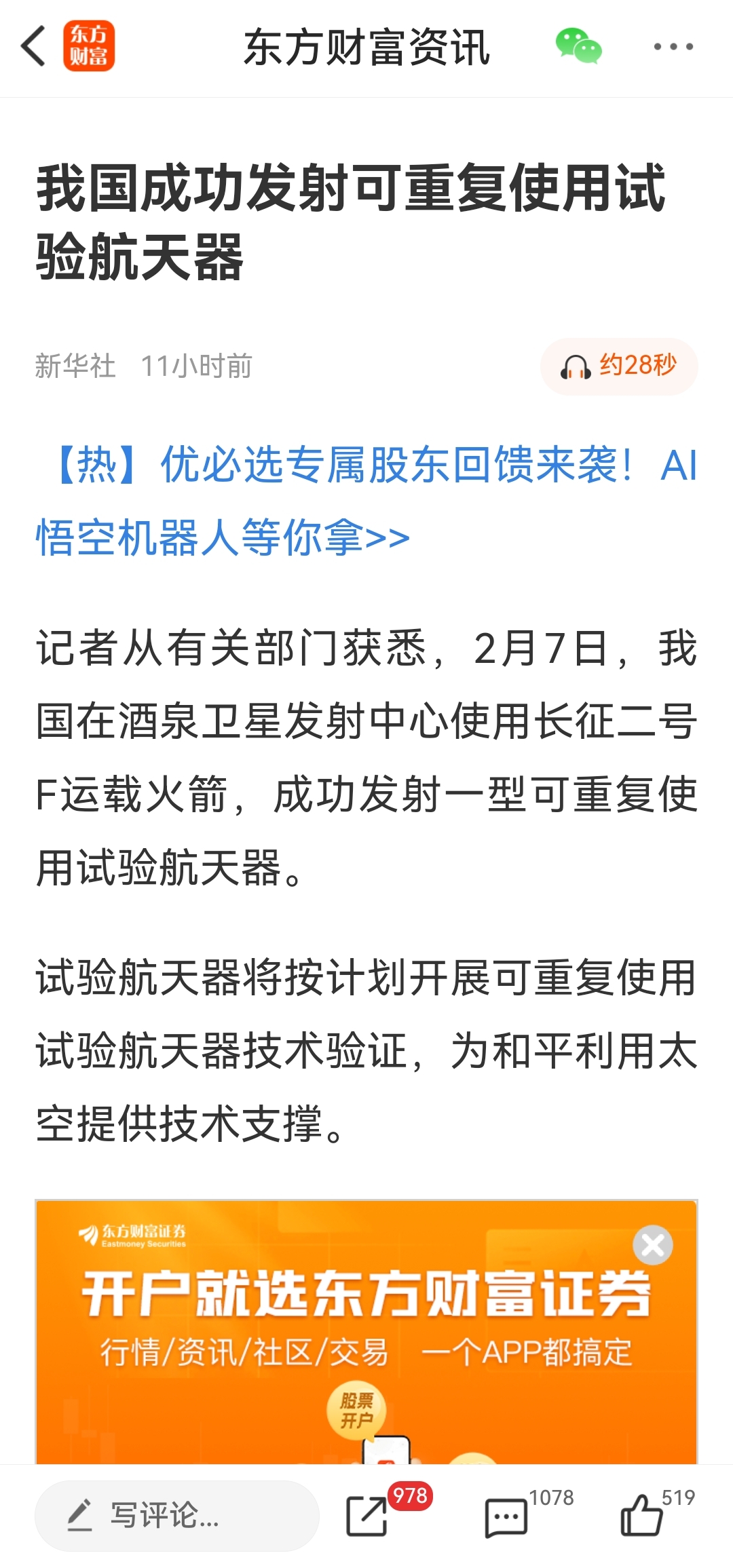 $利亚德(SZ300296)$ 刚刚权威官方媒体头版头条:我国实现成功发射可回收试验航天器。