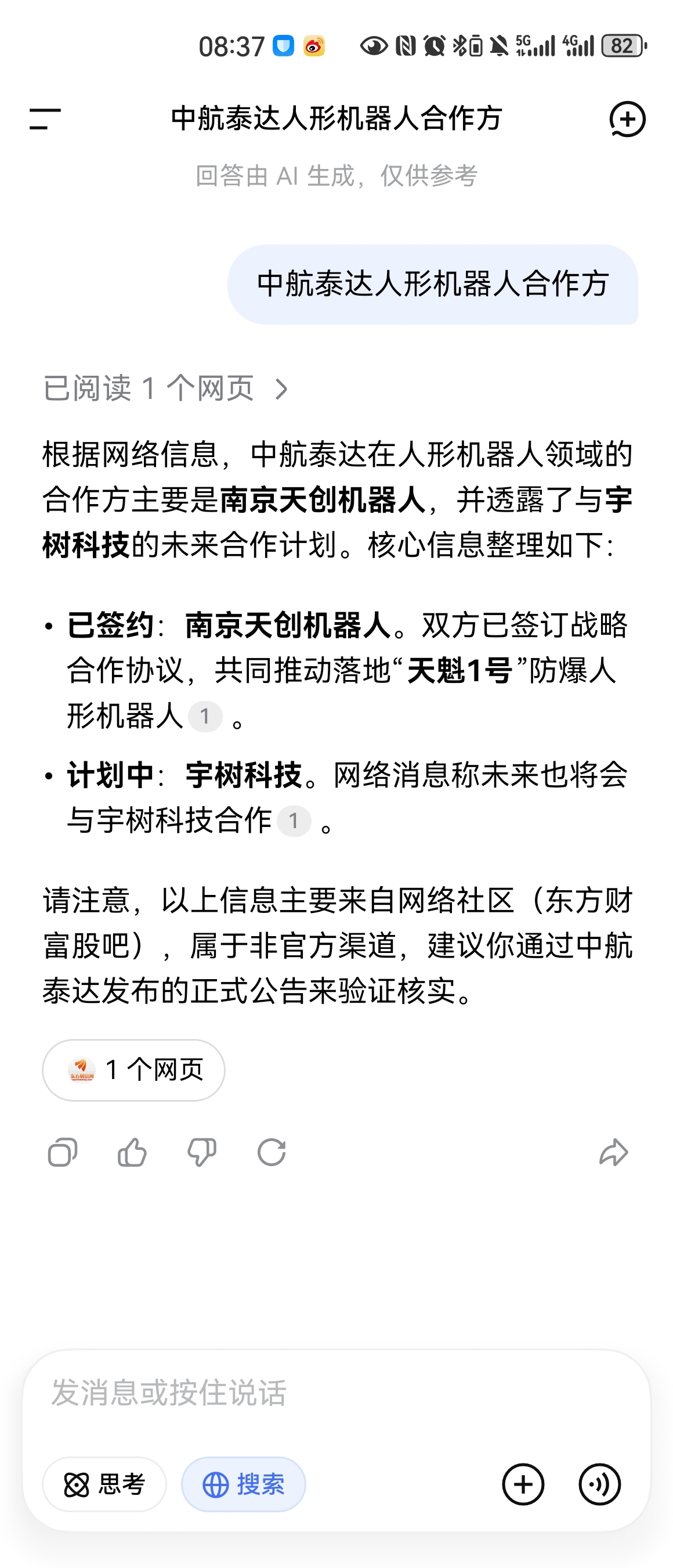 刚挖出来的,中航泰达是“银河通用+宇树科技”双概念股,已经落地合作了。信息捂的真