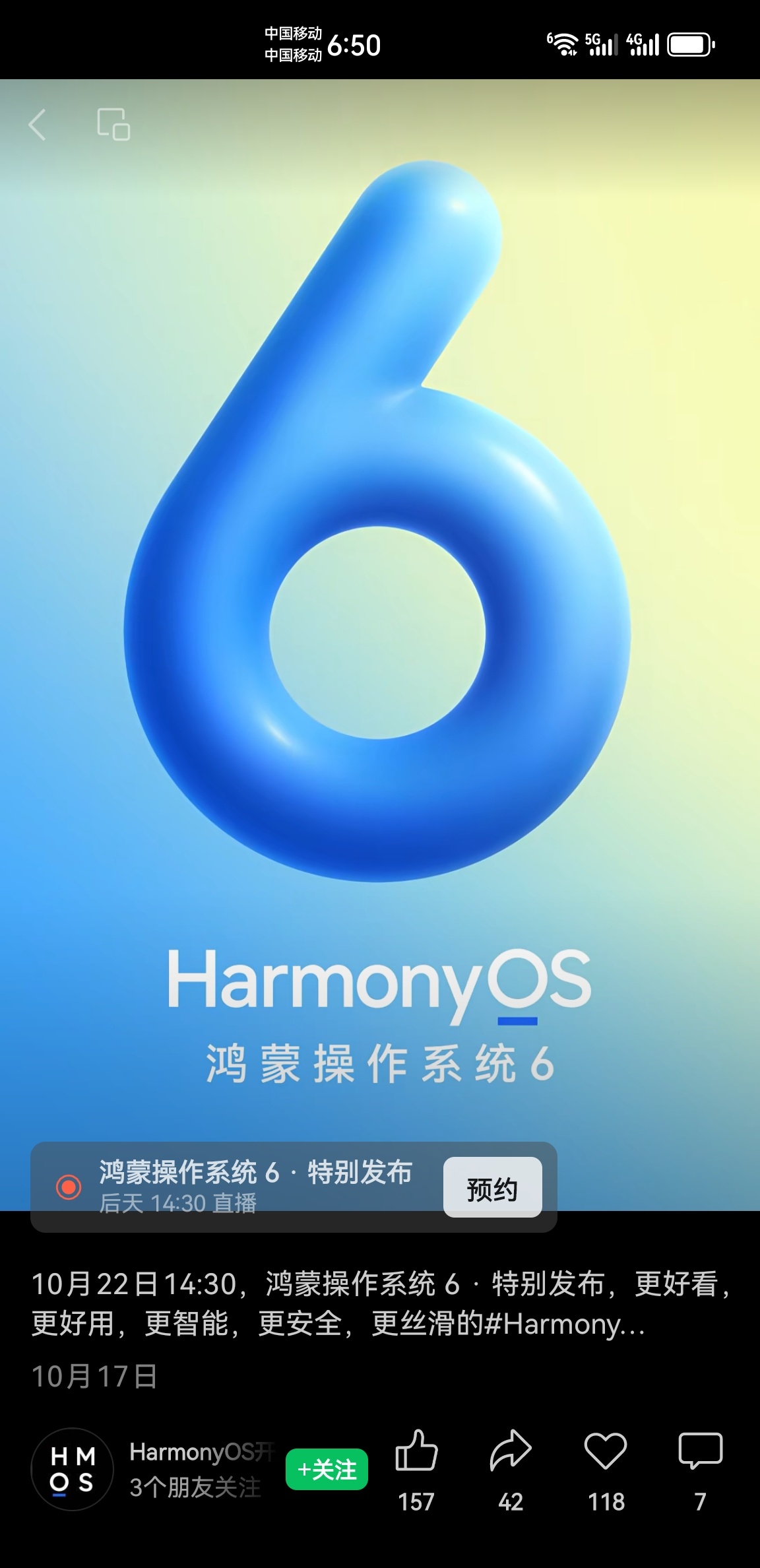 10月22日14:30,鸿蒙操作系统 6 特别发布,更好看,更好用,更智能,更安全,更丝滑的#HarmonyOS6#,敬请期待!
