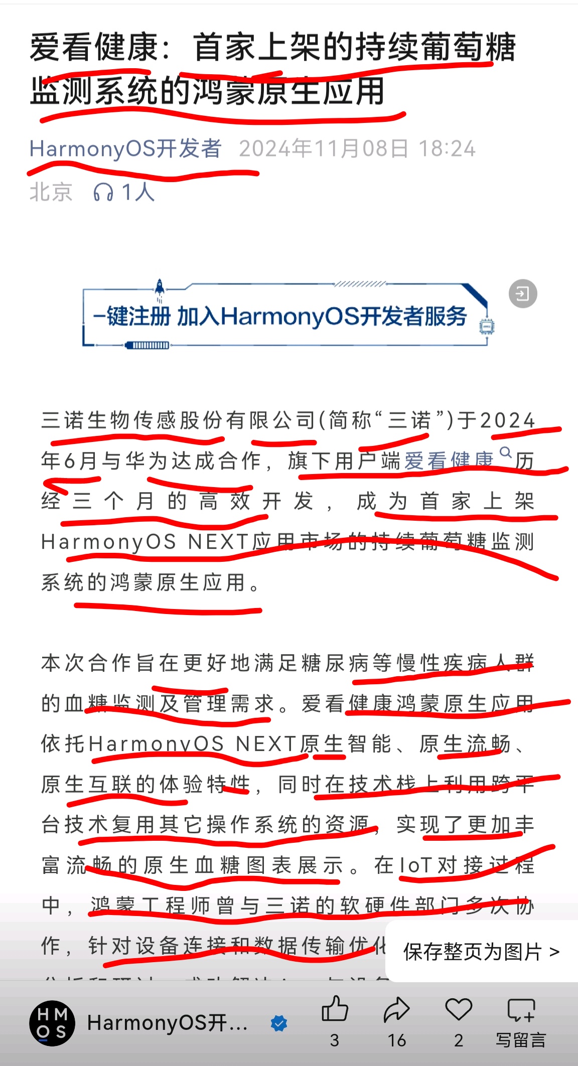 2024年6月,三诺生物传感股份有限公司(简称“三诺”)正式与华为达成战略合作。历经三个月的高效开发,三诺“爱看健康”APP顺利上线HarmonyOS NEXT应用市场,成为该平台首个持续葡萄糖监测系统的鸿蒙原生应用。