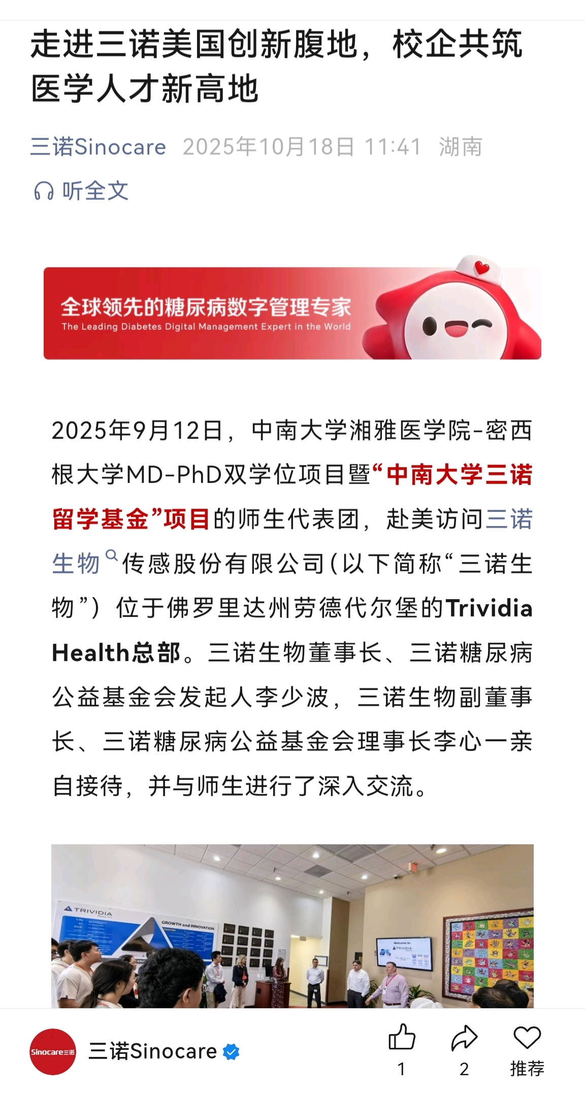 在技术协同之外,三诺生物也通过校企合作持续夯实人才与创新基础。2025年9月,公司董事长李少波与副董事长李心一在美国Trividia总部接待了中南大学-密西根大学MD-PhD双学位项目师生代表团,展示了公司在生产工艺与质量管理方面的系统能力。