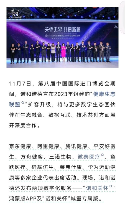 在诺和诺德发起的“健康生态联盟”中,三诺生物是唯一被点名的器械合作方。慢病管理新范式!诺和诺德“健康生态联盟”全面升级 11月7日,第八届中国国际进口博览会期间,诺和诺德宣布2023年组建的“健康生态联盟”扩容升级,将与更多数字生态圈伙伴在生态融合、数据互联、技术共创方面展开深度合作。京东健康、阿里健康、腾讯健康、平安好医生、方舟健客、三诺生物、微泰医疗、鱼跃医疗、硅基仿生、莱弗仕康、华为运动健康等多家企业代表出席活动。现场,诺和诺德还发布两项数字化服务——“诺和关怀”鸿蒙版APP及“诺和关怀”减重专属版。数字化朋友圈再扩容健康生态联盟启新篇数字化发展为慢病管理带来新机遇,作为慢病防控数字化生态建设的“发起者”和“共建者”,诺和诺德不断扩大数字化健康朋友圈,构建“线上+线下”一体化的数字化慢病管理模式,助力医生、赋能患者,利用数字化手段更好地帮助患者进行疾病自我管理。在“健康生态联盟”这一共同组建的数字化平台上,电商企业将助力拓宽服务半径,让健康信息和服务触达更多有需要的人;器械企业推动监测设备与健康管理服务深度融合,搭建起便捷管理的桥梁;科技企业为健康生态注入源源不断的新动力,打通服务与需求间的关键链接。今年,诺和诺德携手阿里健康、方舟健客、京东健康、平安好医生、腾讯健康五大平台,跨界共建数字化慢病管理生态链,让早筛、早诊、早治的理念在智慧医疗场景中得以充分实现。在疾病管理及健康监测领域,我们也迎来了新的联盟伙伴(三诺生物是第一批)。诺和诺德将与微泰医疗、鱼跃医疗合作,将注射笔结合动态血糖仪,使患者可实时在健康报告中查看血糖动态数据与胰岛素注射记录,形成闭环管理。同时,“诺和关怀”将与华为运动健康对接,整合运动、心率等数据,进一步丰富健康报告内容,提升管理效率。“诺和关怀”新品发布拓展服务边界“诺和关怀”平台由“诺和关怀”APP与“诺和关怀”小程序共同构成,是诺和诺德赋能患者疾病自我管理的“双核”解决方案,不仅为患者提供全面的健康管理服务,还成为产业伙伴的共创平台。该平台自2021年1月上线,最初为使用诺和诺德糖尿病药物患者提供个性化健康管理支持,后拓展到罕见病及肥胖领域。此次活动上,“诺和关怀”发布两个新版本——鸿蒙版APP与“诺和关怀”减重专属版。