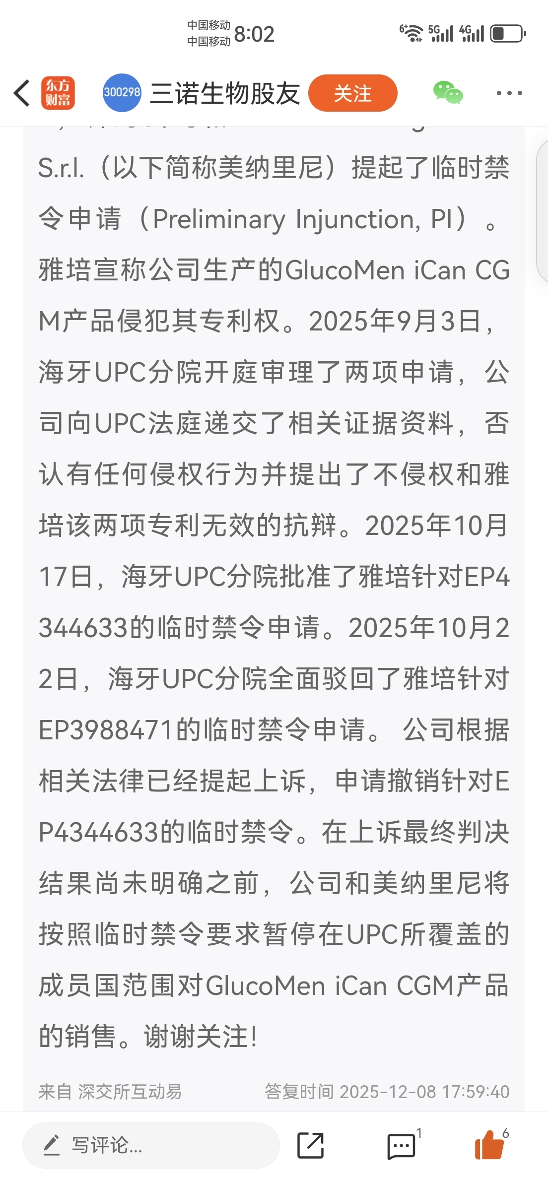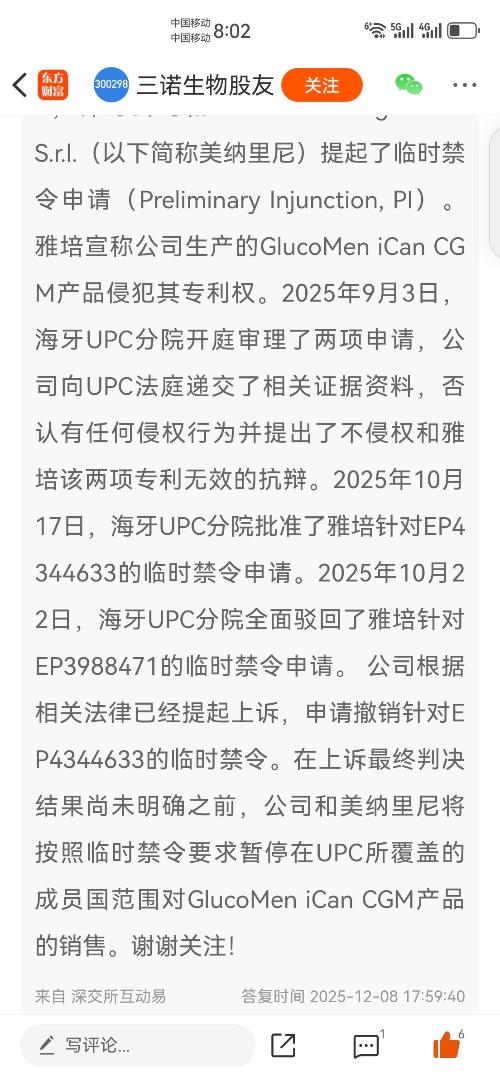 您好,董秘!请回复下公司最近机构调研情况、十大流通股东持股变动情况及欧洲海牙法院对雅培诉讼专利案的进展!谢谢!答您好!1.公司调研情况请关注公司披露的《投资者关系活动记录表》,根据信息披露公平原则,公司将在定期报告中披露对应时点的前十大流通股东信息。若您需要查询定期报告对应时点之外的股东信息,烦请将您的个人有效身份证件及持股证明文件发送至公司邮箱(investor@sinocare.com),公司将在核实您股东身份后按照要求予以提供。2.2025年7月4日,雅培在海牙UPC分院,就其两项欧洲EPO专利EP4344633和EP3988471,针对公司和A Menarini Diagnostics S.r.l.(以下简称美纳里尼)提起了临时禁令申请(Preliminary Injunction, PI)。雅培宣称公司生产的GlucoMen iCan CGM产品侵犯其专利权。2025年9月3日,海牙UPC分院开庭审理了两项申请,公司向UPC法庭递交了相关证据资料,否认有任何侵权行为并提出了不侵权和雅培该两项专利无效的抗辩。2025年10月17日,海牙UPC分院批准了雅培针对EP4344633的临时禁令申请。2025年10月22日,海牙UPC分院全面驳回了雅培针对EP3988471的临时禁令申请。 公司根据相关法律已经提起上诉,申请撤销针对EP4344633的临时禁令。在上诉最终判决结果尚未明确之前,公司和美纳里尼将按照临时禁令要求暂停在UPC所覆盖的成员国范围对GlucoMen iCan CGM产品的销售。谢谢关注!来自深交所互动易答复时间2025-12-08 1