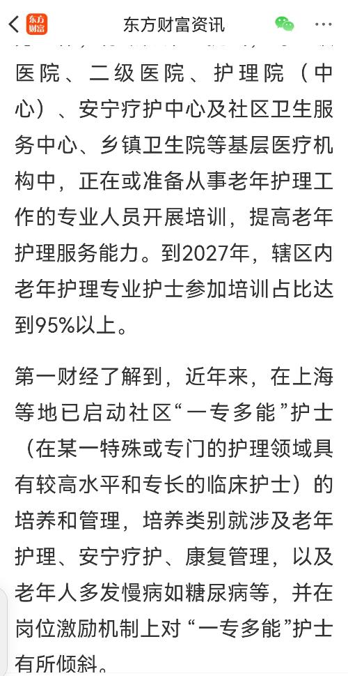 第一财经了解到,近年来,在上海等地已启动社区“一专多能”护士(在某一特殊或专门的护理领域具有较高水平和专长的临床护士)的培养和管理,培养类别就涉及老年护理、安宁疗护、康复管理,以及老年人多发慢病如糖尿病等,并在岗位激励机制上对 “一专多能”护士有所倾斜。