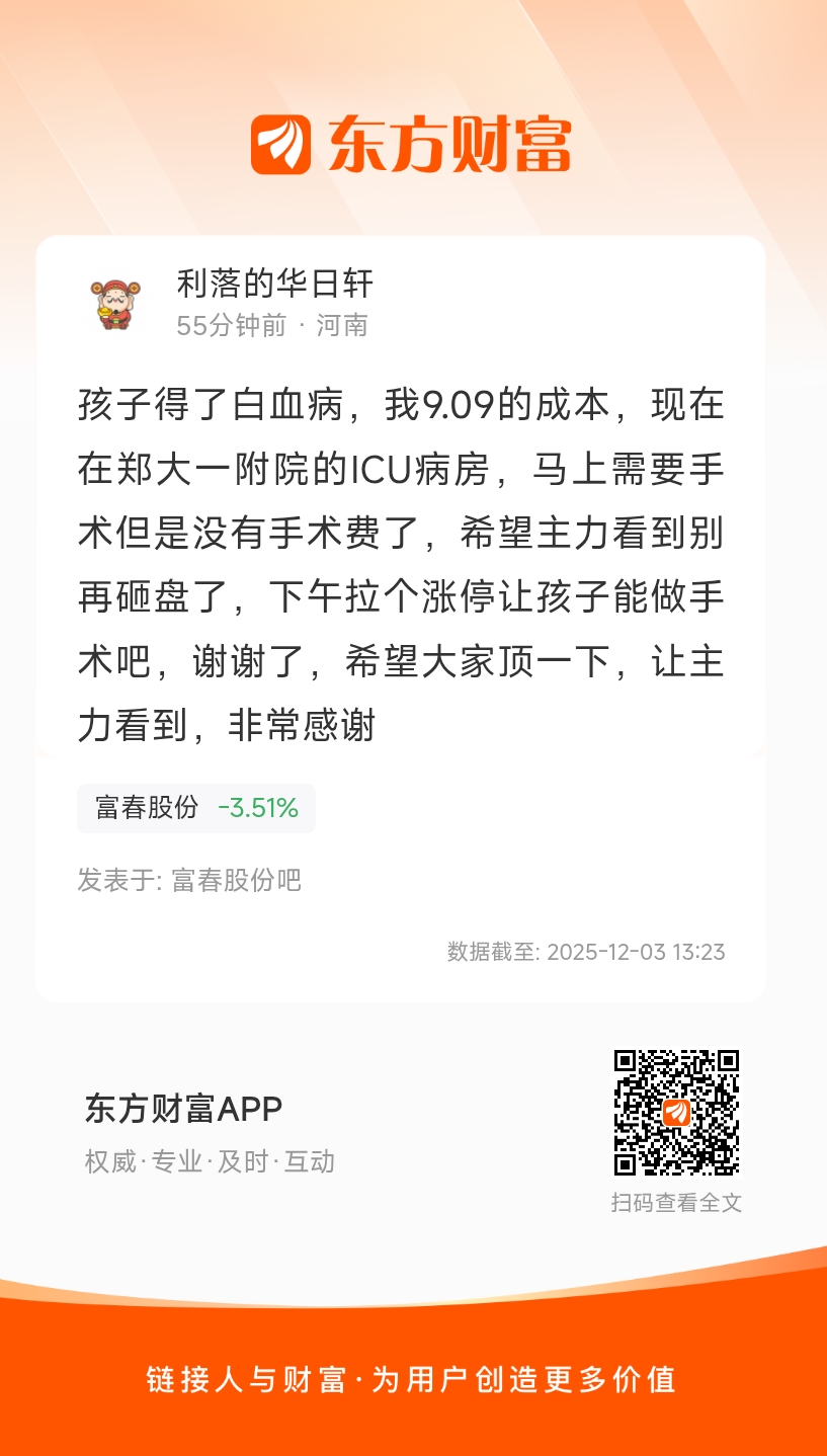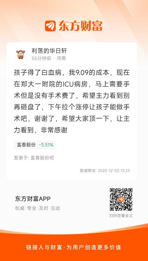 孩子得了白血病,我9.09的成本,现在在郑大一附院的ICU病房,马上需要手术但是没有手术费了,希望主力看到别再砸盘了,下午拉个涨停让孩子能做手术吧,谢谢了,希望大家顶一下,让主力看到,非常感谢