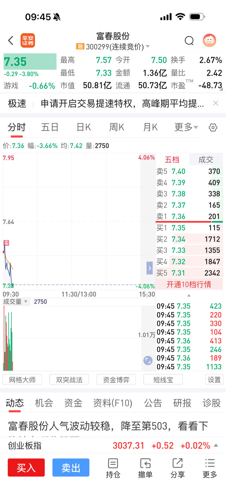 $富春股份(SZ300299)$ 天天挂7.39买不到,今天一进来你就这样,真是有监控