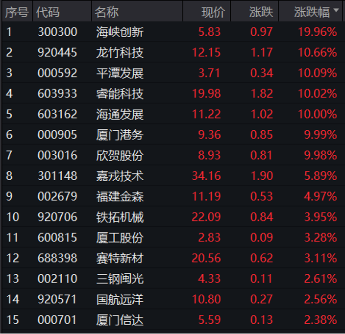 10月17日早盘,福建本地股表现亮眼,海峡创新“20cm”涨停,平潭发展、睿能科技、海通发展、厦门港务、欣贺股份涨停,龙竹科技上涨10.66%,其他还有嘉戎技术、福建金森上涨均超4%。