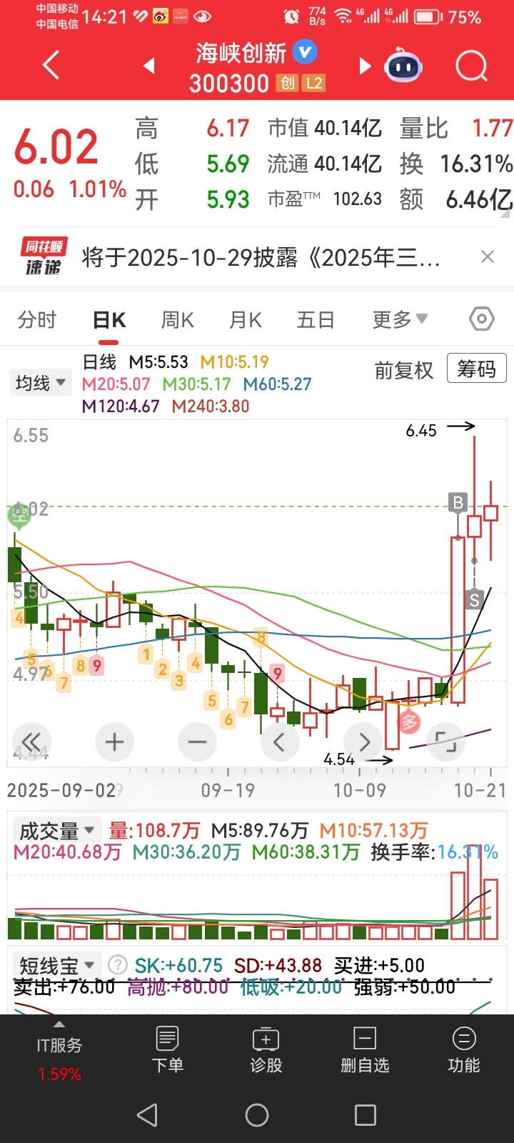 $海峡创新(SZ300300)$ $海峡创新(300300)$ 今天被大盘和板块带动涨幅不大,明天大盘指数风除草动即可转向。