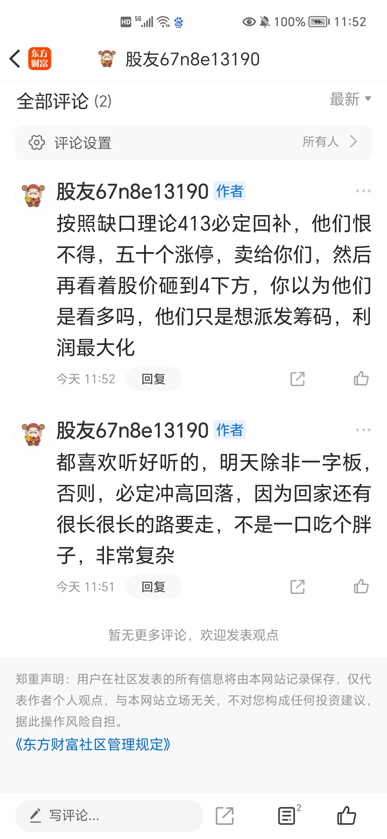 温馨提示: 1.根据《证券法》规定,禁止编造、传播虚假信息或者误导性信息,扰乱证券市场;2.用户在本社区发表的所有资料、言论等仅代表个人观点,与本网站立场无关,不对您构成任何投资建议。用户应基于自己的独立判断,自行决定证券投资并承担相应风险。《东方财富社区管理规定》