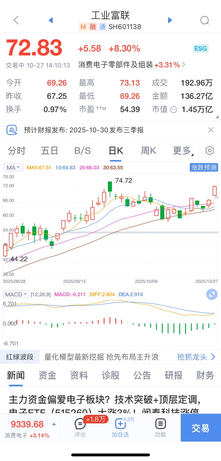 午盘:下午到现在还是没有量,预测量能这么下去只有2.3万亿收盘,这是准备无量摸4千的了,无量摸了感觉也站不住的,第三季报的炒作主要还是科技股为主,月底前有预期的都在提前潜伏提前涨,周五的方正科技今天出了三季报也没能新高还高开回落,今晚胜宏科技三季报肯定也是大增,具体就看潜伏资金明天怎么走向了。$海峡创新(SZ300300)$ $向日葵(SZ300111)$