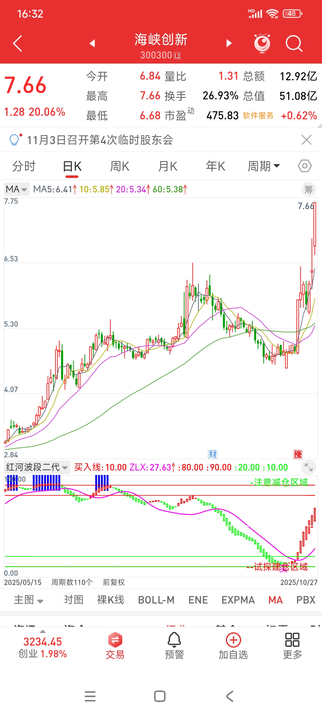 $海峡创新(SZ300300)$ 底部出现买字加绿柱转红柱做确认,之后价格一路上扬,这个毫无疑问看涨,已经很直观了,今天加速涨停也很正常。竟红柱不停,上涨不止,红柱拉长,加速不止,继续冲