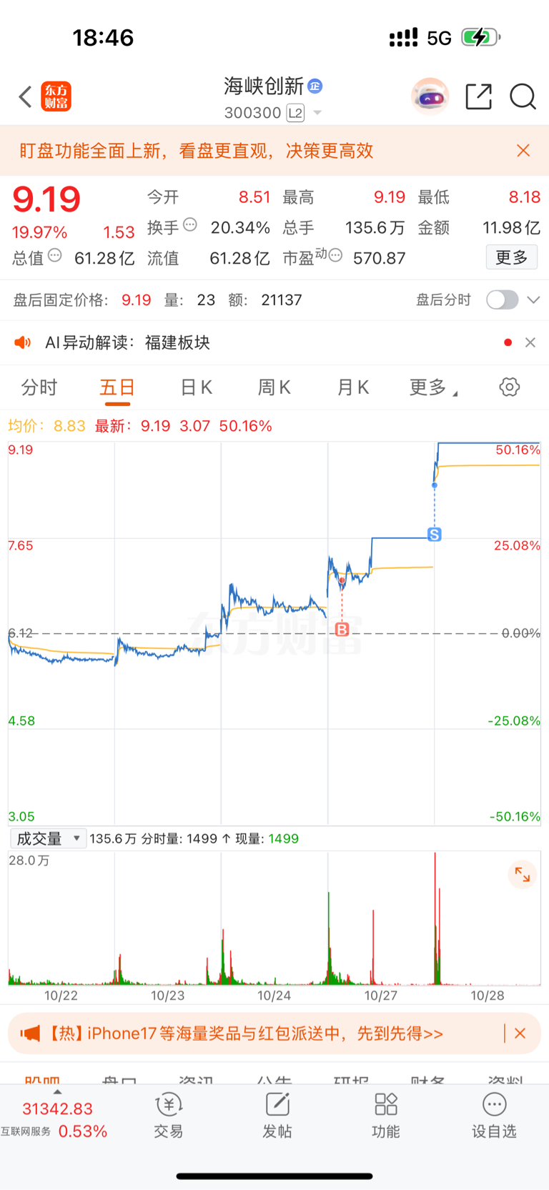$海峡创新(SZ300300)$ 卖飞了,不过两天赚20几个点,也满足了,祝车上的兄弟们继续赚钱