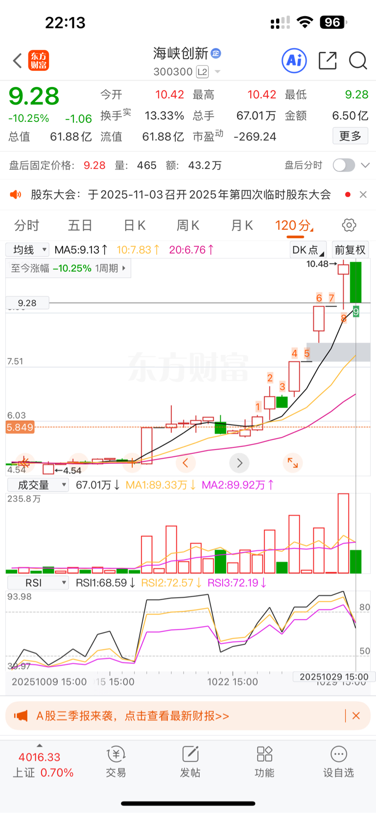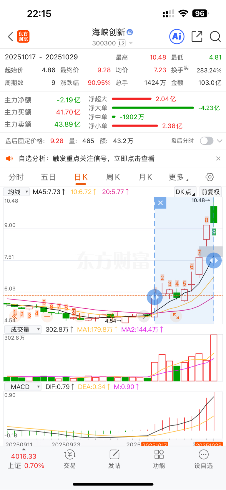 $海峡创新(SZ300300)$ 今天这个量一般来说就是天量天价必走的。有点不明白的是看了下120分K,上午换手46下午13,假设下午不砸盘,第二天溢价走不好吗?10天100的异动是9.72,再假设下午的砸盘是躲异动呢,9.28收涨幅是91,明天7个点以下就不会触发,即使后天涨停也不会触发了。否则就是出完货砸盘,吃相太难看了!
