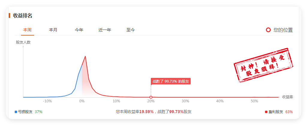 截止昨天我的收益排名战胜99.8的股民,老师们恐怕看不到我的车尾灯了。