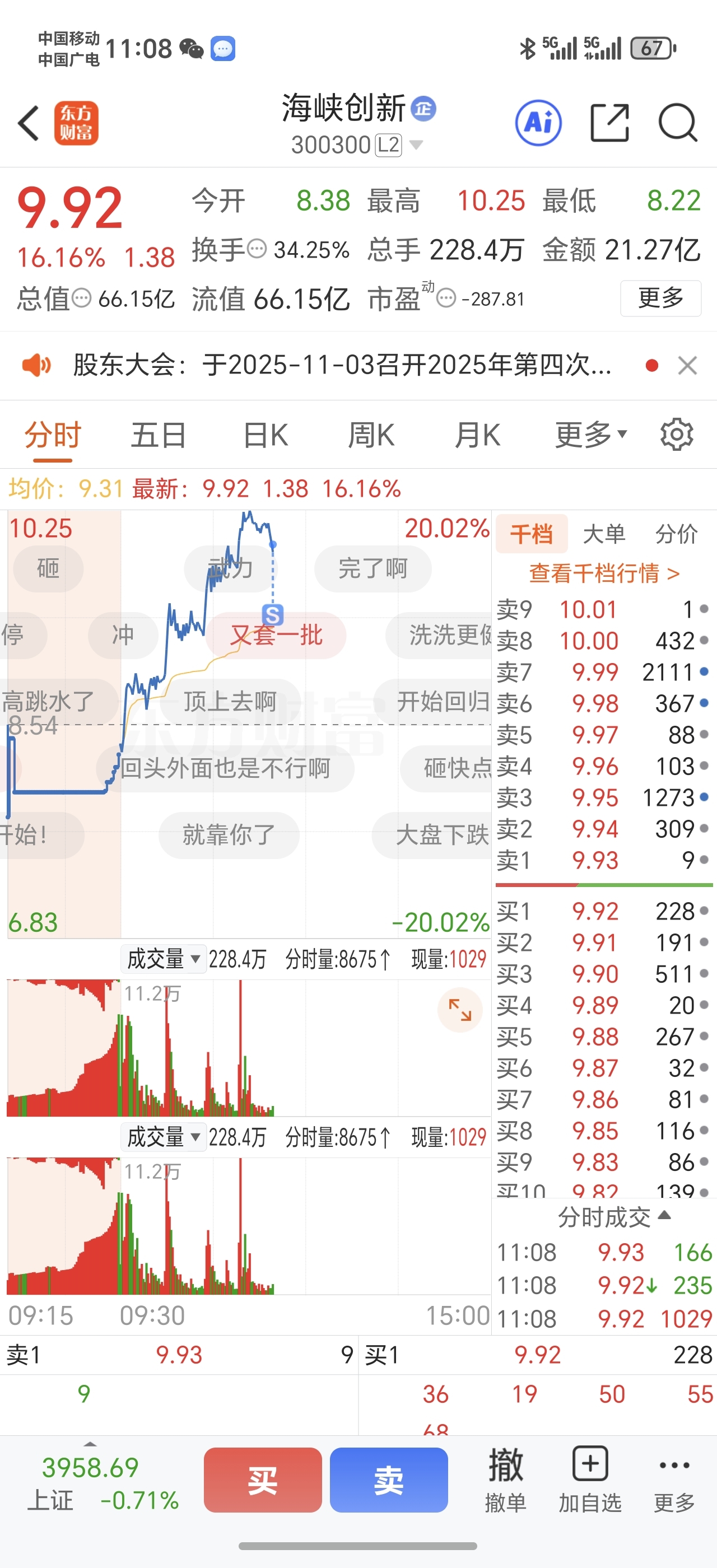 $海峡创新(SZ300300)$ 感谢大佬们,昨天买的,跌破10块铁定走了