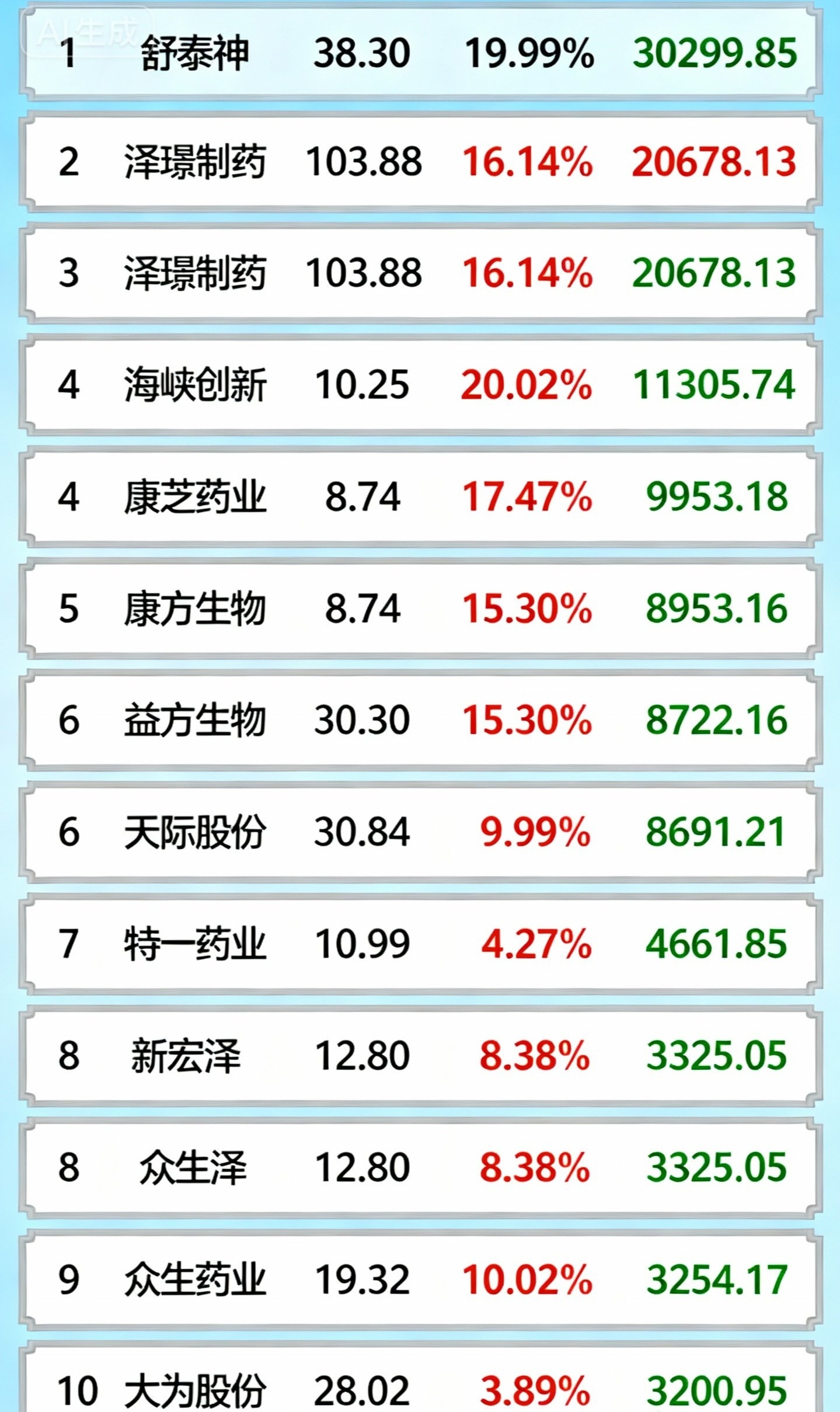 值得注意的是,当日龙虎榜资金总净流入冠军为三六零,净买入额达6.91亿元,虽未进入机构净买入前十,但作为AI安全领域龙头,其涨停行情反映出科技赛道的资金热度 。而机构重点布局的医药股多伴随大幅上涨,舒泰神、海峡创新等个股均以涨停或接近涨停价收盘,显示机构对板块短期走势的强烈看好。