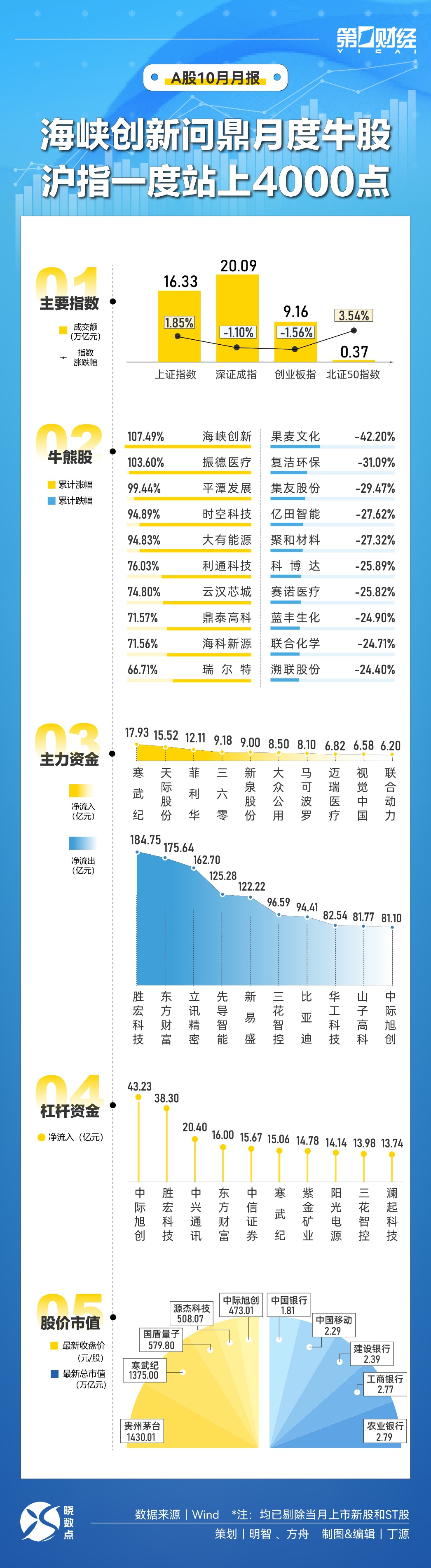 晓数点|速览10月A股:海峡创新问鼎月度牛股 沪指一度站上4000点