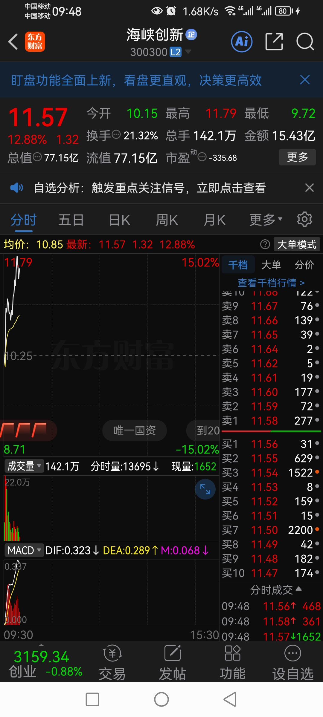 $海峡创新(SZ300300)$ 11.55元已全体清仓,上星期五最低8.25元抄底。这波每股赚了它3块多。感谢感谢,祝留下的兄弟们财源广进