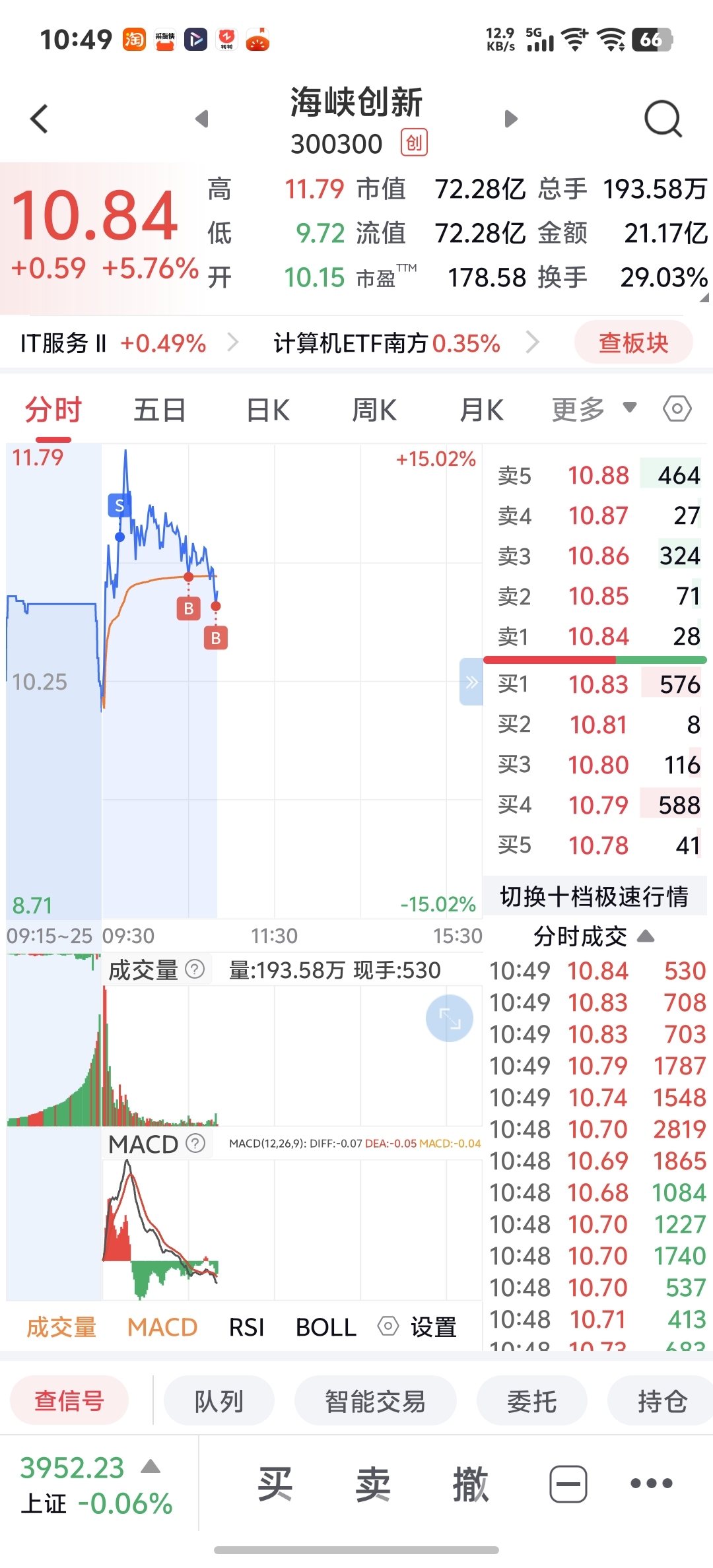 $海峡创新(SZ300300)$ 10.8已成,等待10.5大规模补仓
