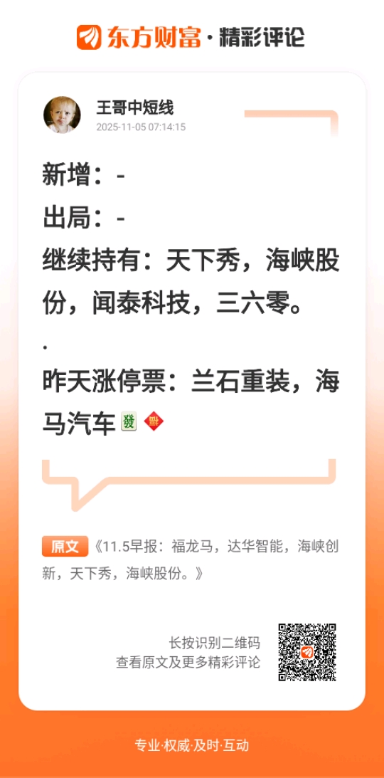 早报:天下秀,海峡股份,闻泰科技,三六零(继续持有)。
