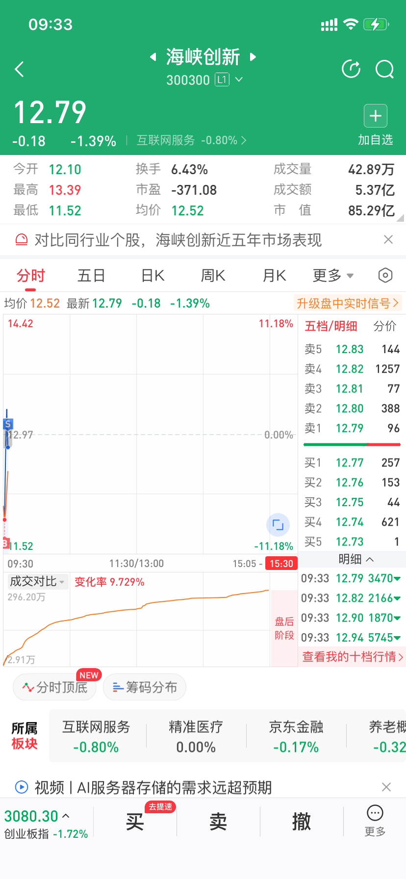 $海峡创新(SZ300300)$ 11.82入,13.23出,得劲。。。