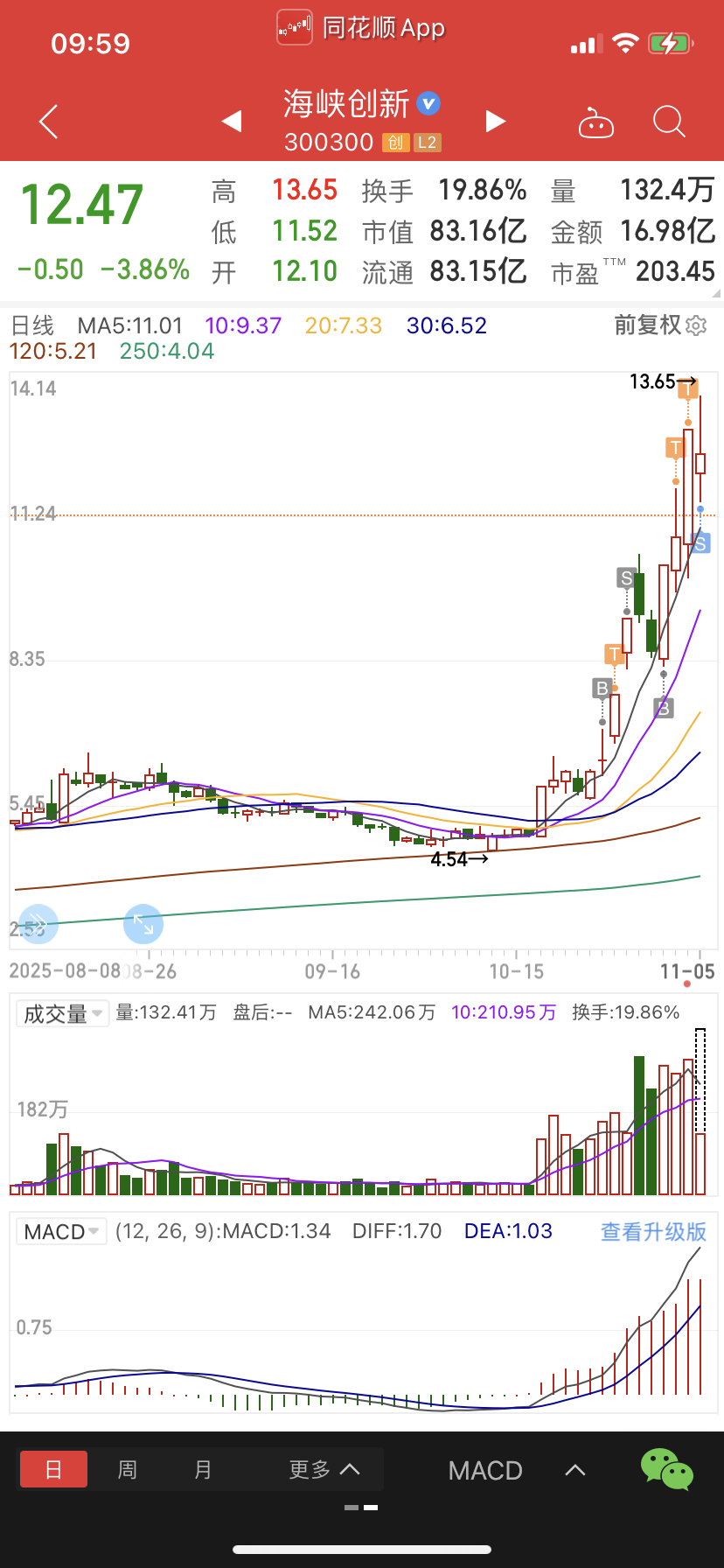$海峡创新(SZ300300)$ 6.4进来,13.3走了,接近一倍,感恩走人,祝剩下的吃肉,祝早日统一